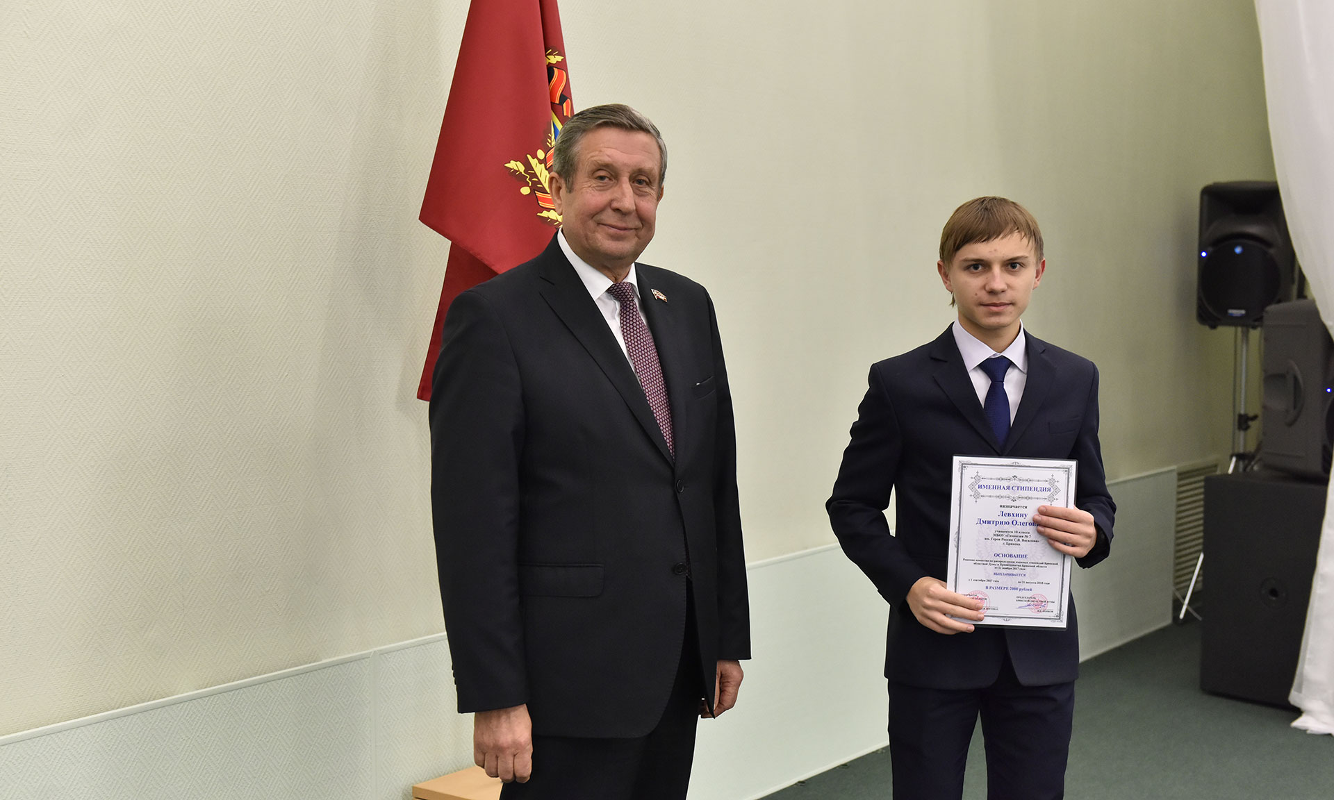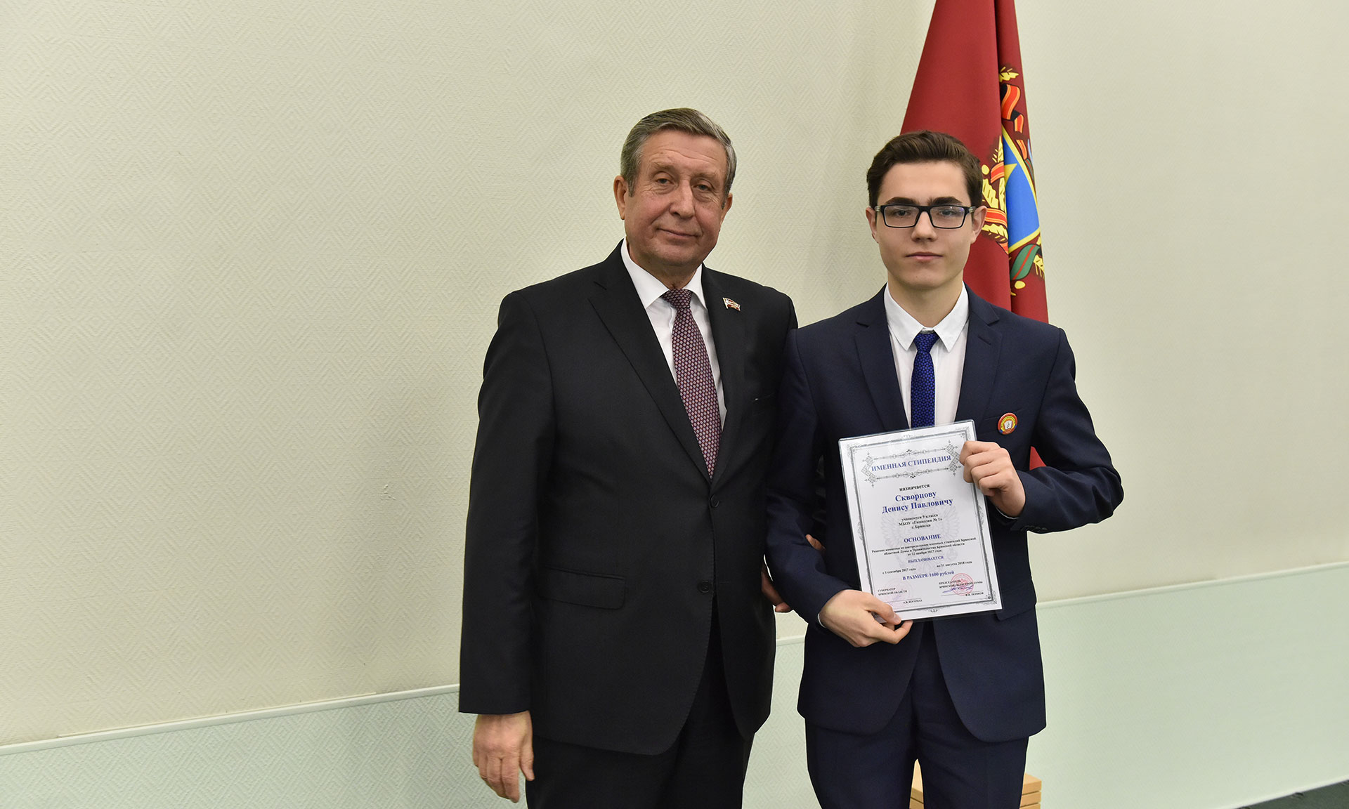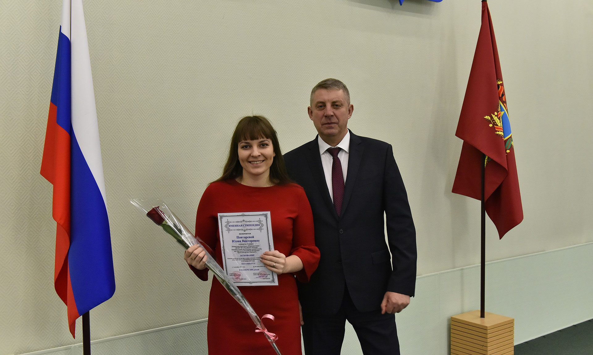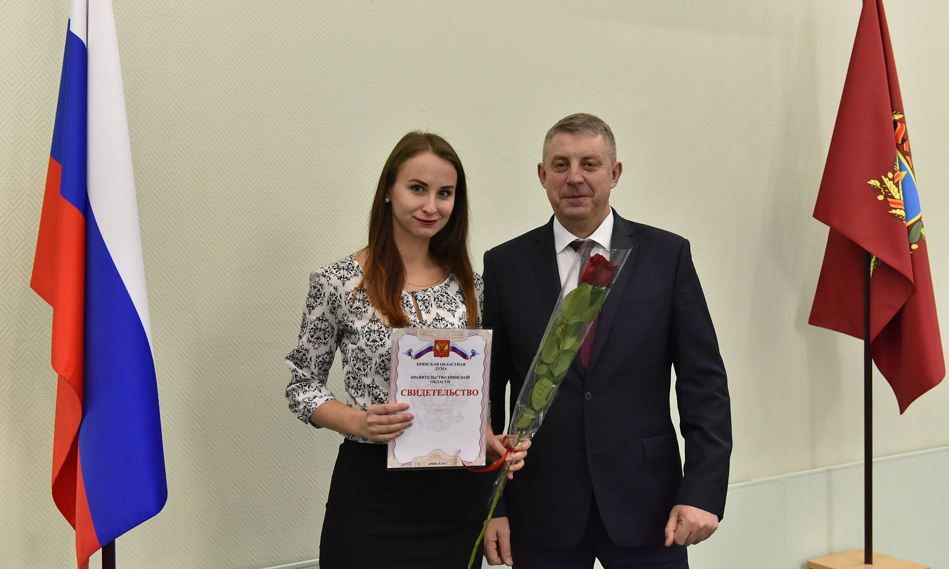 28 ноября в Хрустальном зале Правительства Брянской области состоялась торжественная церемония чествования именных стипендиатов Брянской областной Думы и Правительства Брянской области, а также вручение свидетельств о назначении именных стипендий Правительства Брянской области имени П. Л. Проскурина.