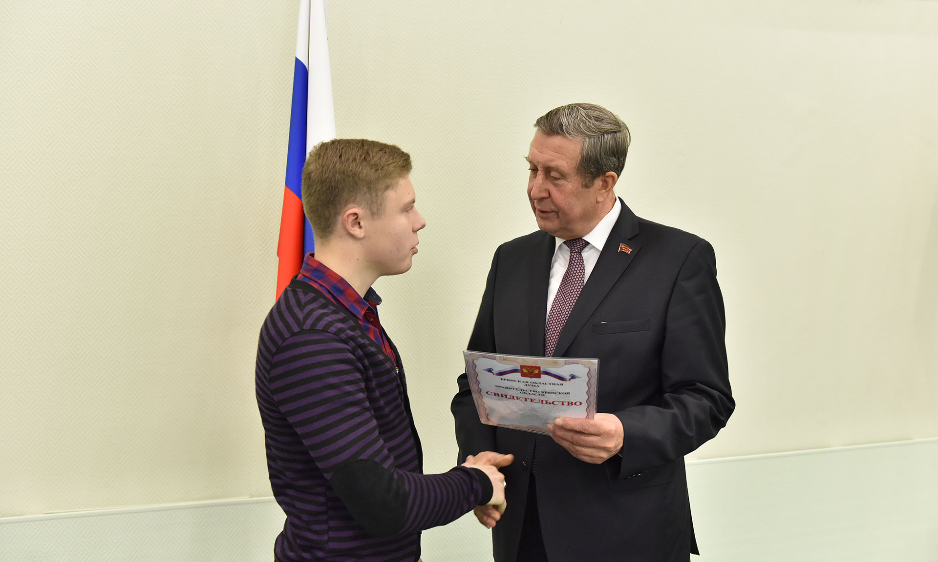 От имени депутатов Брянской областной Думы стипендиатов, их родителей и педагогов поздравил председатель регионального парламента Владимир Попков: