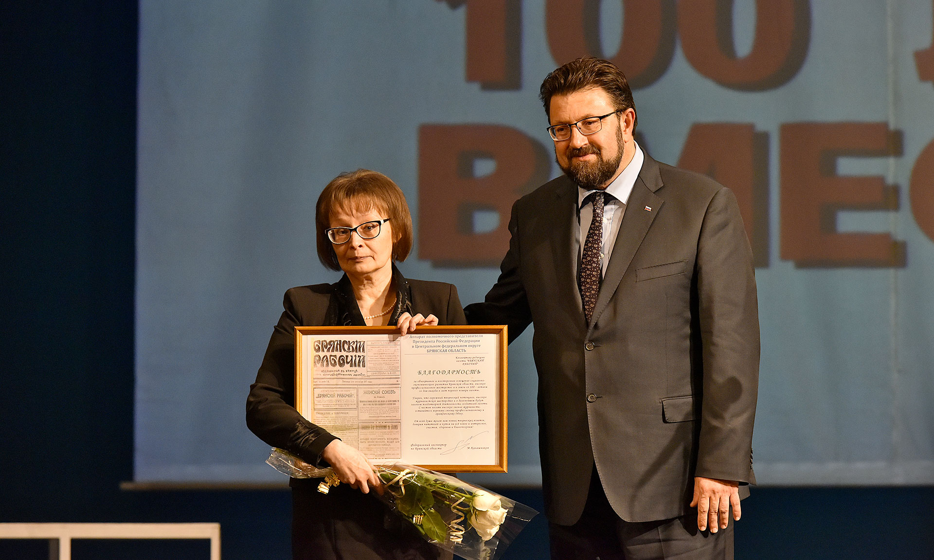 За большой вклад в общественно-политическое, социально-экономическое, культурное развитие Брянской области и в связи со 100-летием со дня выхода первого номера Почетной грамотой Губернатора Брянской области награжден коллектив редакции газеты «Брянский рабочий», Благодарственными письмами Губернатора Брянской области награждены директор ООО «Брянский рабочий» Алексей Кадомский, главный редактор газеты «Брянский рабочий» Ирина Марченкова, ветеран брянской журналистки Александр Нестик, обозреватель редакции газеты «Брянский рабочий» Николай Егоров, ветераны журналистики Юлия Курнявцева, Александр Шкроб.