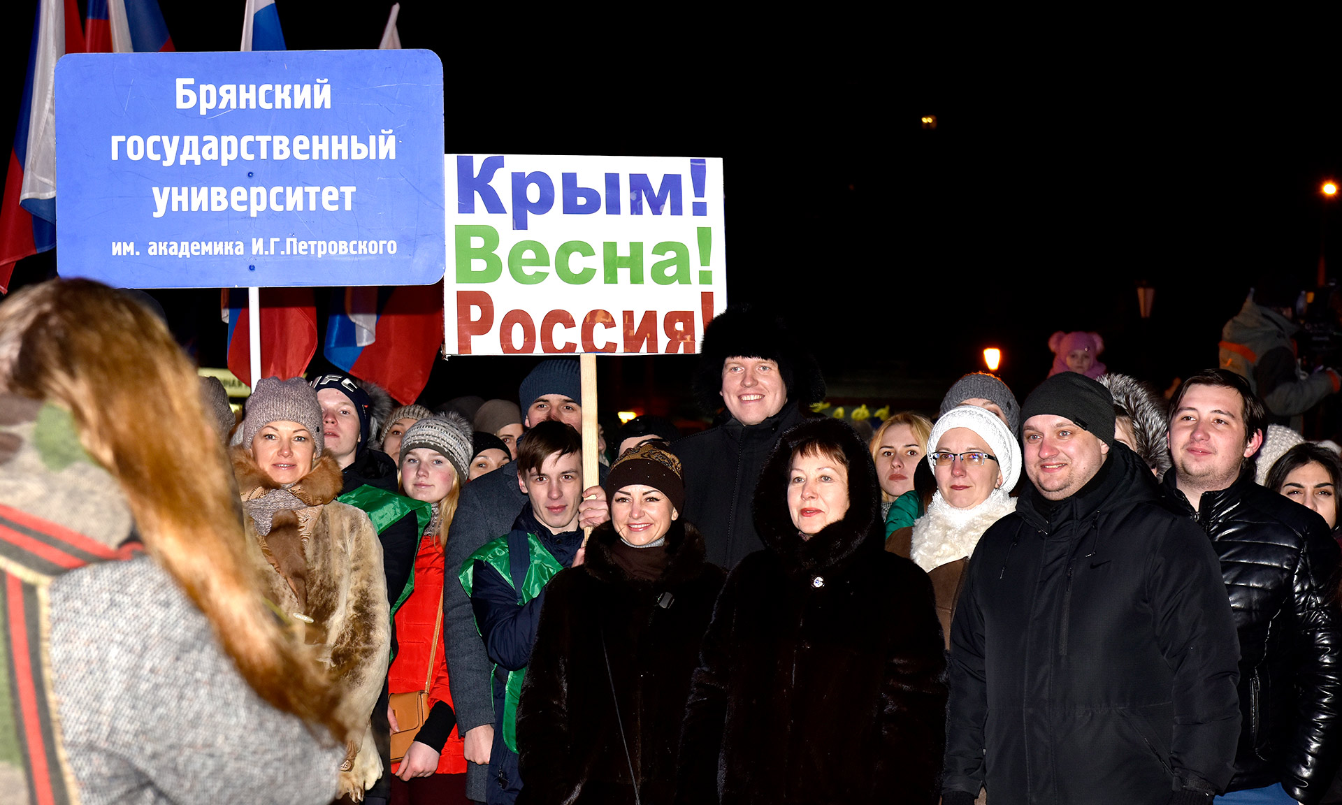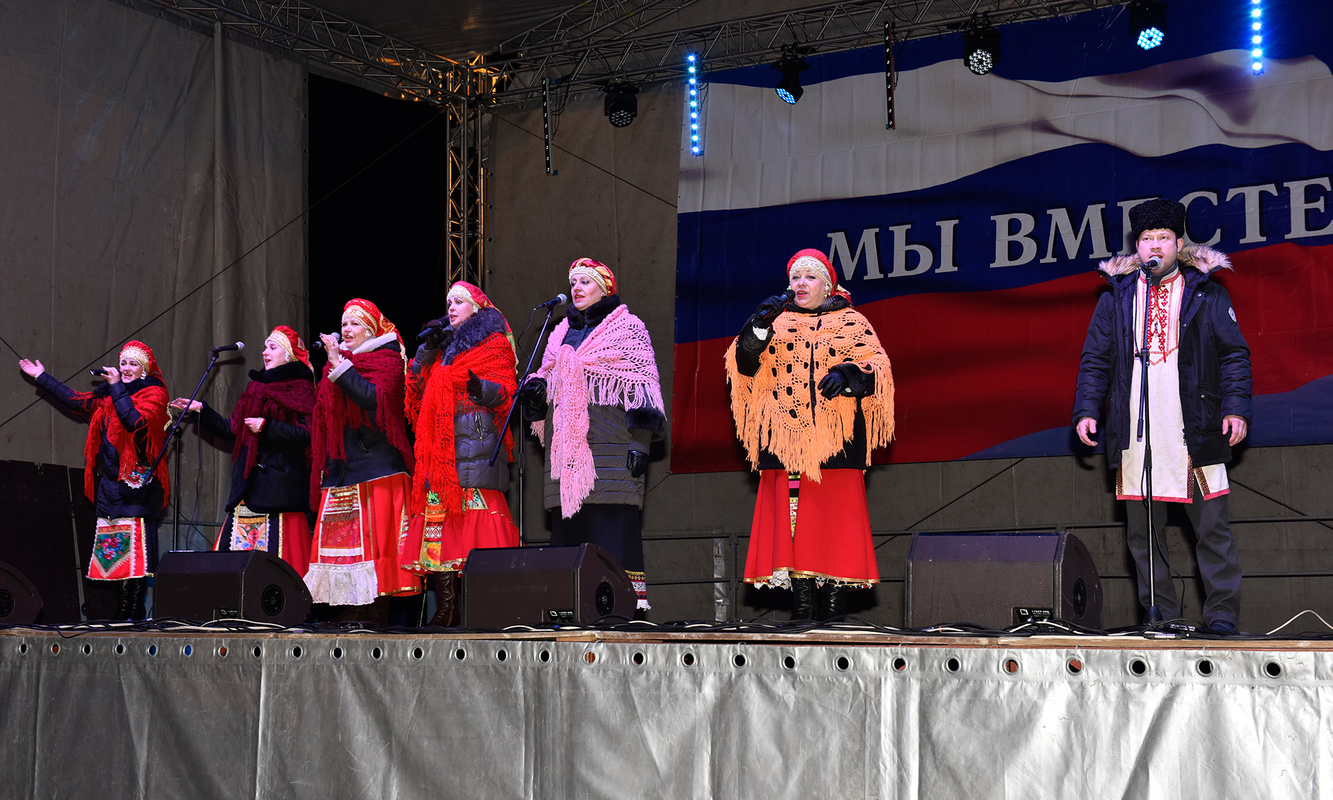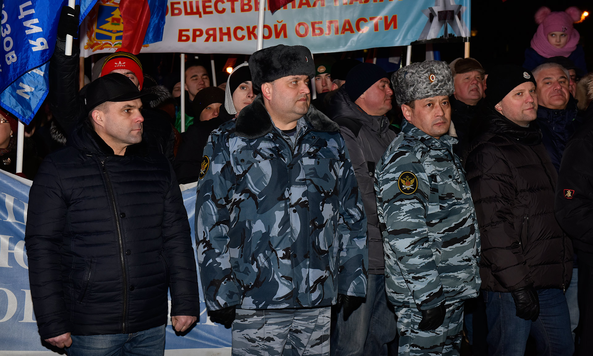 Ансамбль народной музыки «Ватага» исполнил песню «Россию строят мужики», которой подпевала вся площадь. Брянщина сделала свой выбор, и это курс на стабильность и устойчивое развитие страны. Рабочие Бежицы, представители предприятий и организаций Фокинского района, Володарский и Советский районы Брянска — тысячи людей собрались этим вечером на площади Воинской Славы, чтобы подтвердить, что им не нужны потрясения и войны, им нужна спокойная мирная жизнь.