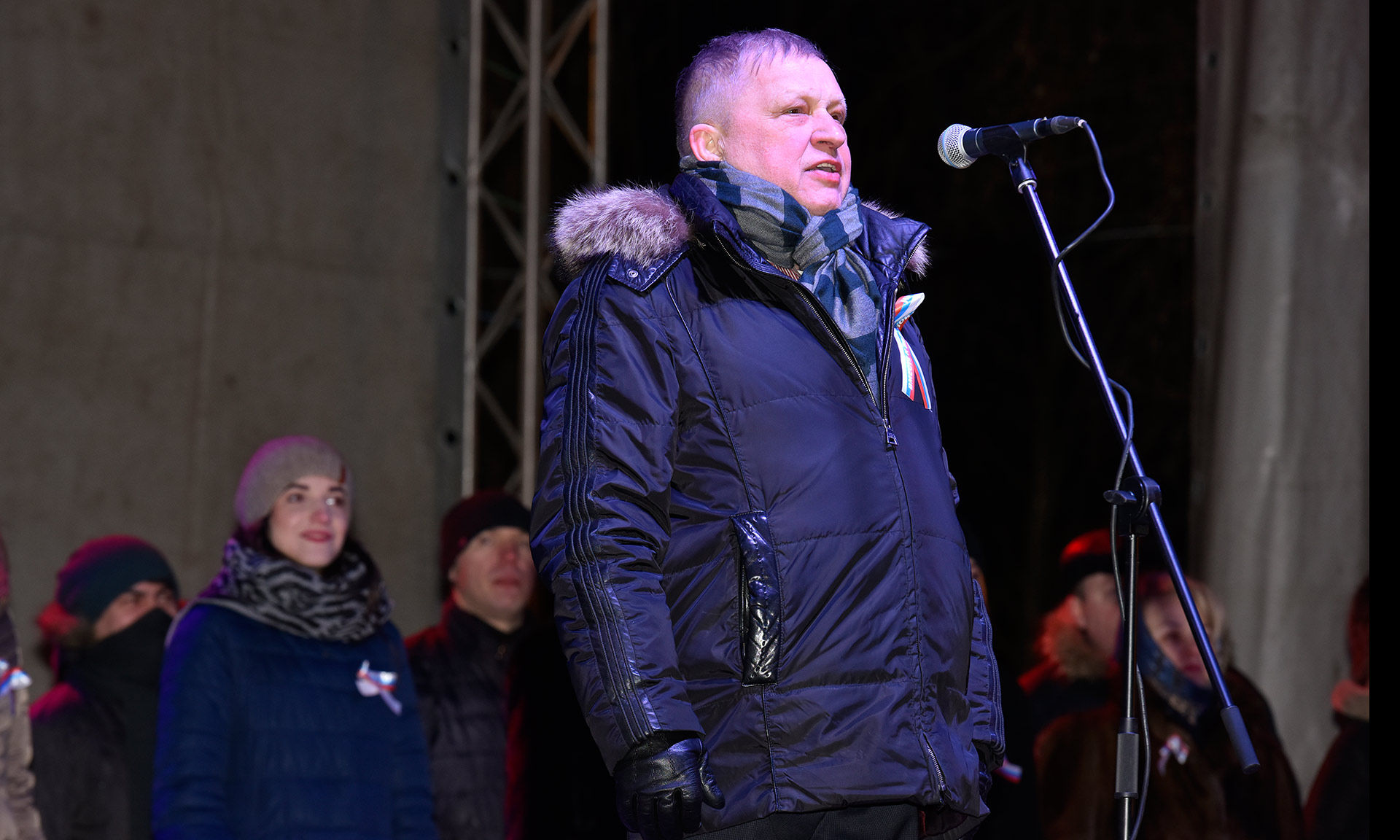 — Уважаемые земляки! Стало доброй, хорошей традицией Крымскую весну брянцам встреч вместе. Четвертая годовщина воссоединения Крыма и России ознаменована историческим событием — сегодня каждый из нас мог сделать свой выбор, выбор в пользу великой, могучей России. И этот выбор сделан! Счастье нашей Родины, ее величие и процветание укладывается в простую формулу: сильный Президент — гарант Конституции — Владимир Владимирович Путин! С ним наше будущее! Я поздравляю вас, уважаемые земляки! Счастья, благополучия и процветания нашей Родине и нашей Брянщине!