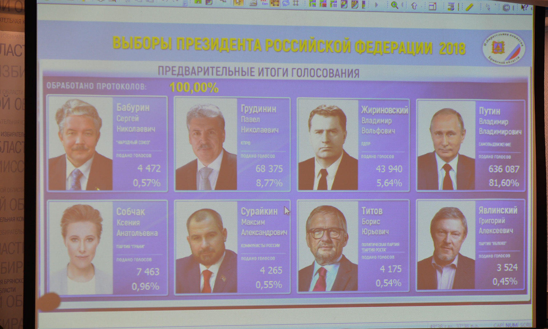 Председатель Избирательной комиссии Брянской области подчеркнула, что явка на этих президентских выборах в регионе была прецедентно высокой, одной из самых высоких по стране, то есть люди целенаправленно шли выбирать своего президента и знали о том, что от их голоса зависит будущее страны. Традиционно наибольшую активность проявили жители Гордеевского, Красногорского, Навлинского районов.