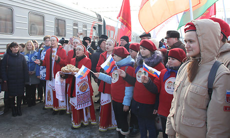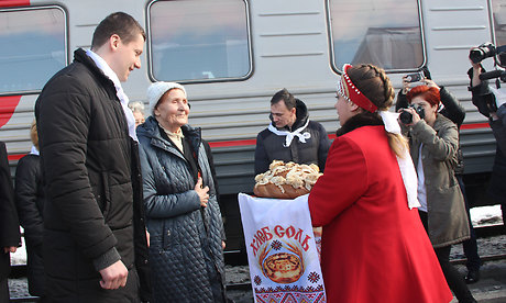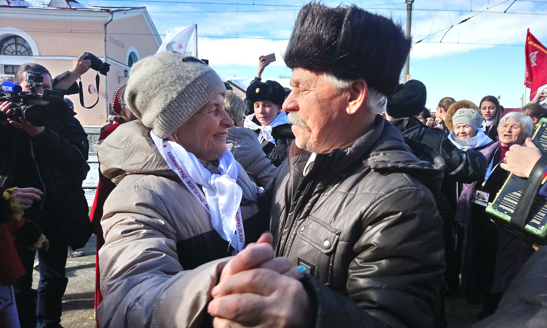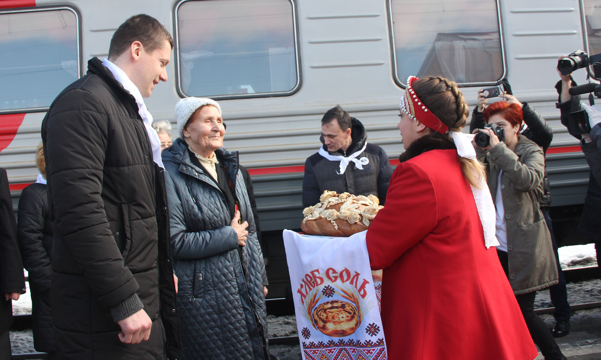 На перроне вокзала станции «Брянск I» делегацию Калининградской области встретил творческий коллектив Брянского областного колледжа искусств и преподнес участникам акции хлеб с солью, а также исполнил песню о брянской земле.