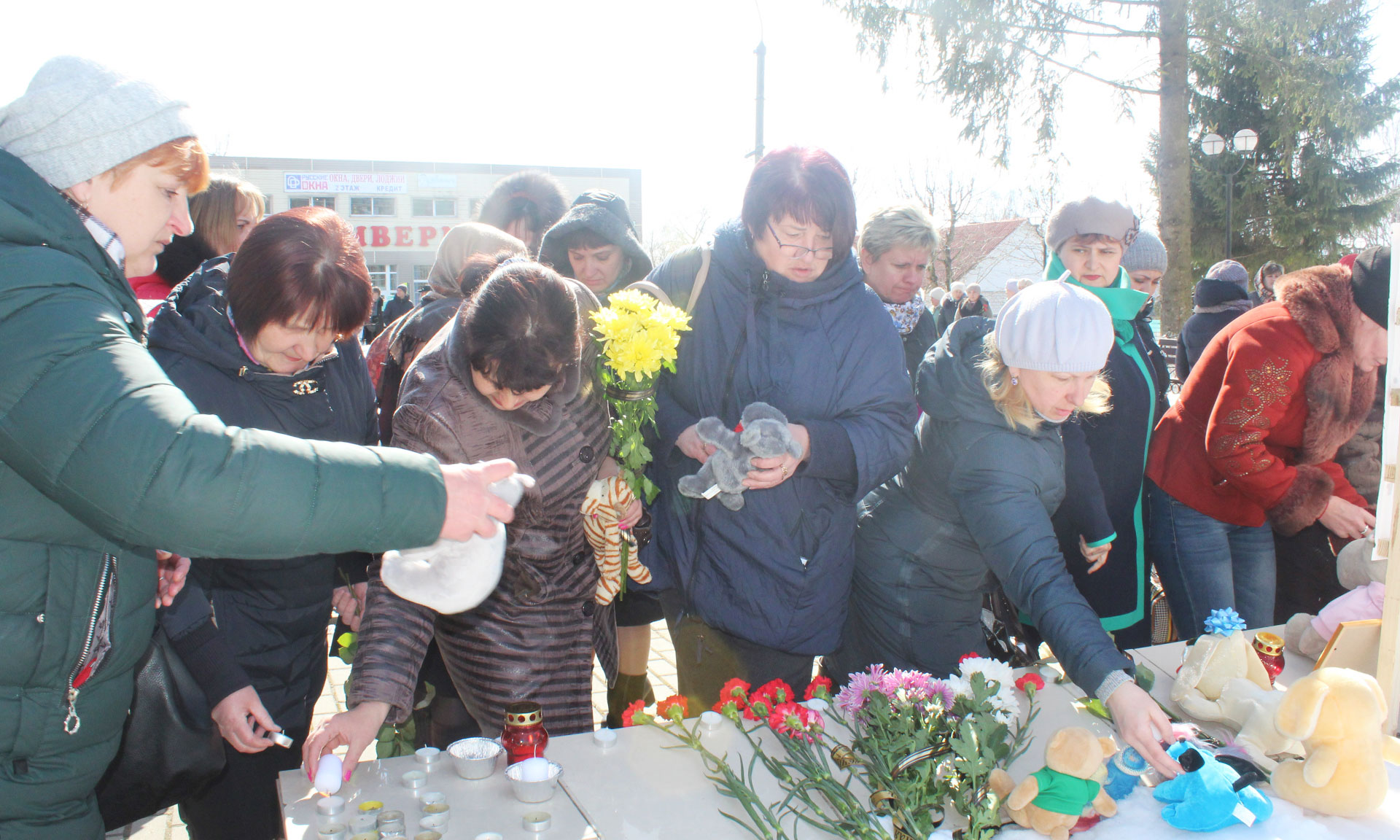 Возле районного дома культуры собрались жители, дети, молодежь, руководители и сотрудники организаций и учреждений, чтобы почтить память погибших при пожаре в торговом центре. Горе Кемерова объединило всех жителей нашего района, отозвалось в сердце каждого, кто способен переживать и сочувствовать. Эта трагедия тяжелая вдвойне — ведь больше половины погибших дети. Присутствующие почтили память погибших минутой молчания. К импровизированному мемориалу возложили цветы, игрушки, зажгли лампадки и свечи — в память о тех, кого уже нет.