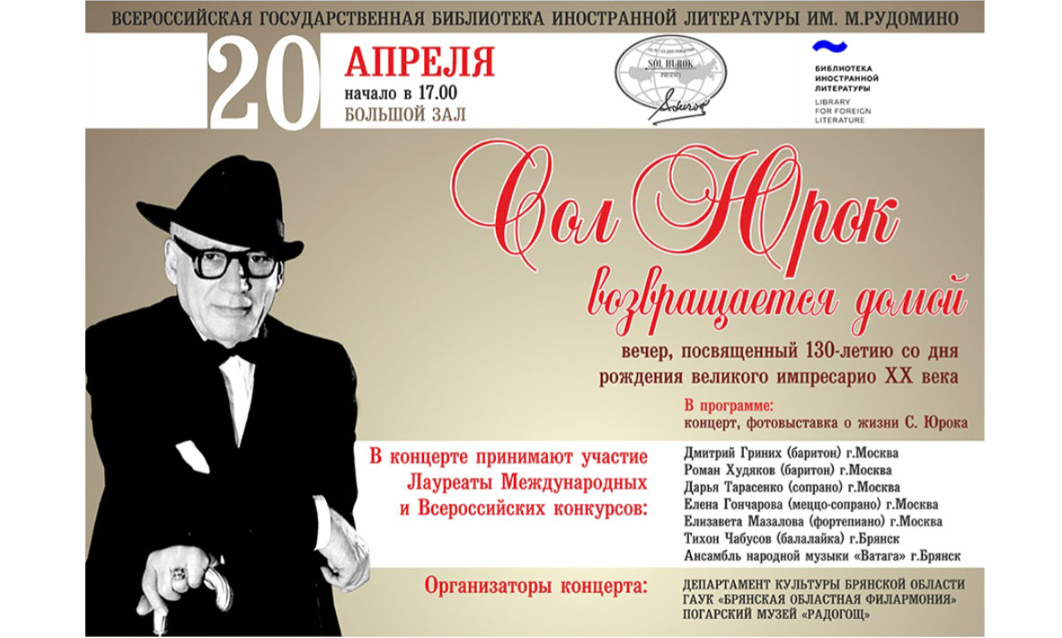 В программе концерта выступления солистов московских театров и Центра оперного пения им. Г. П. Вишневской — уроженцев Брянщины. В мраморном зале библиотеки все желающие смогут ознакомиться с развернутой фотовыставкой о жизни и творчестве Сола Юрока, подготовленной специалистами Погарского музея «Радогощ». Культурные события, посвященные Солу Юроку продлятся до конца года.
