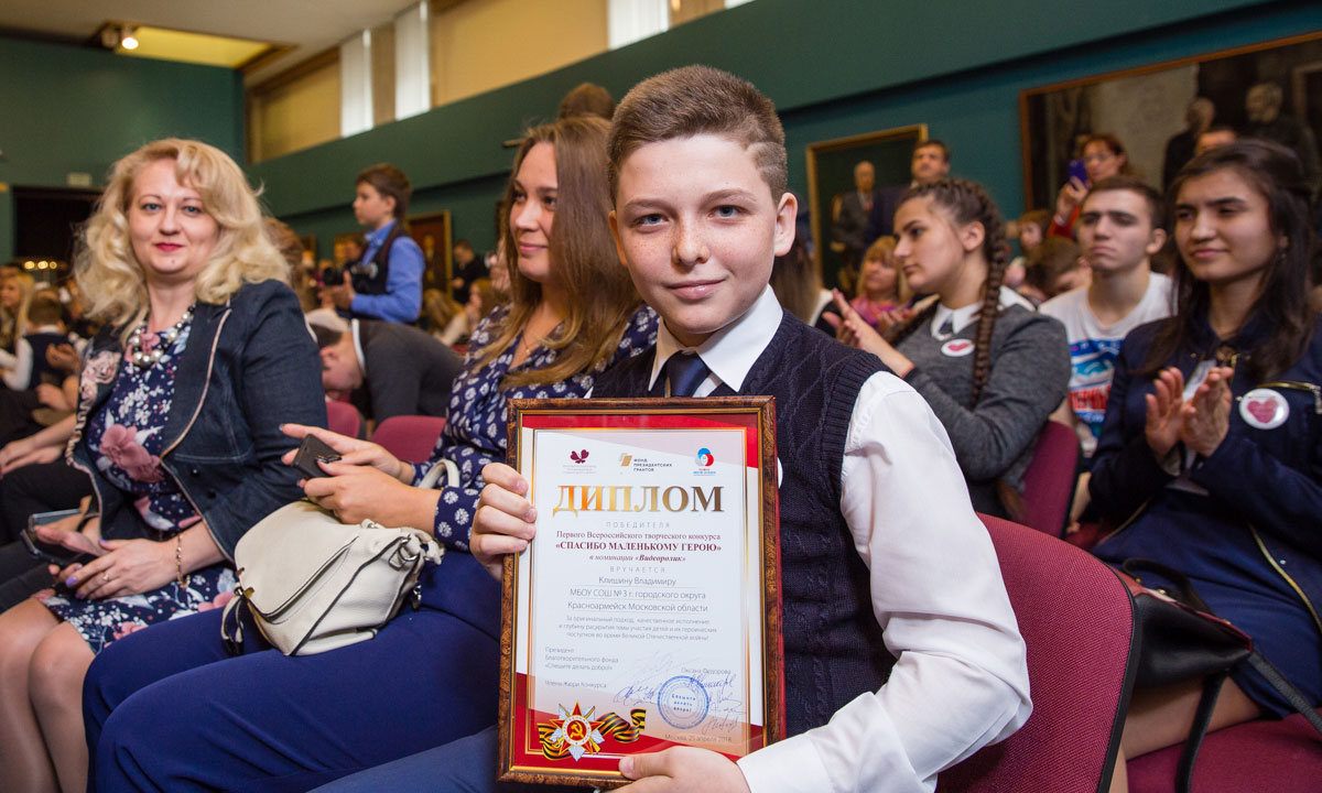 25 апреля 2018 года в московском Музее Победы подвели итоги Всероссийского творческого конкурса «Спасибо маленькому герою». В музее собрались победители конкурса — школьники из многих регионов России, чьи работы были высоко оценены членами жюри.