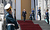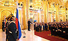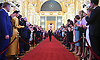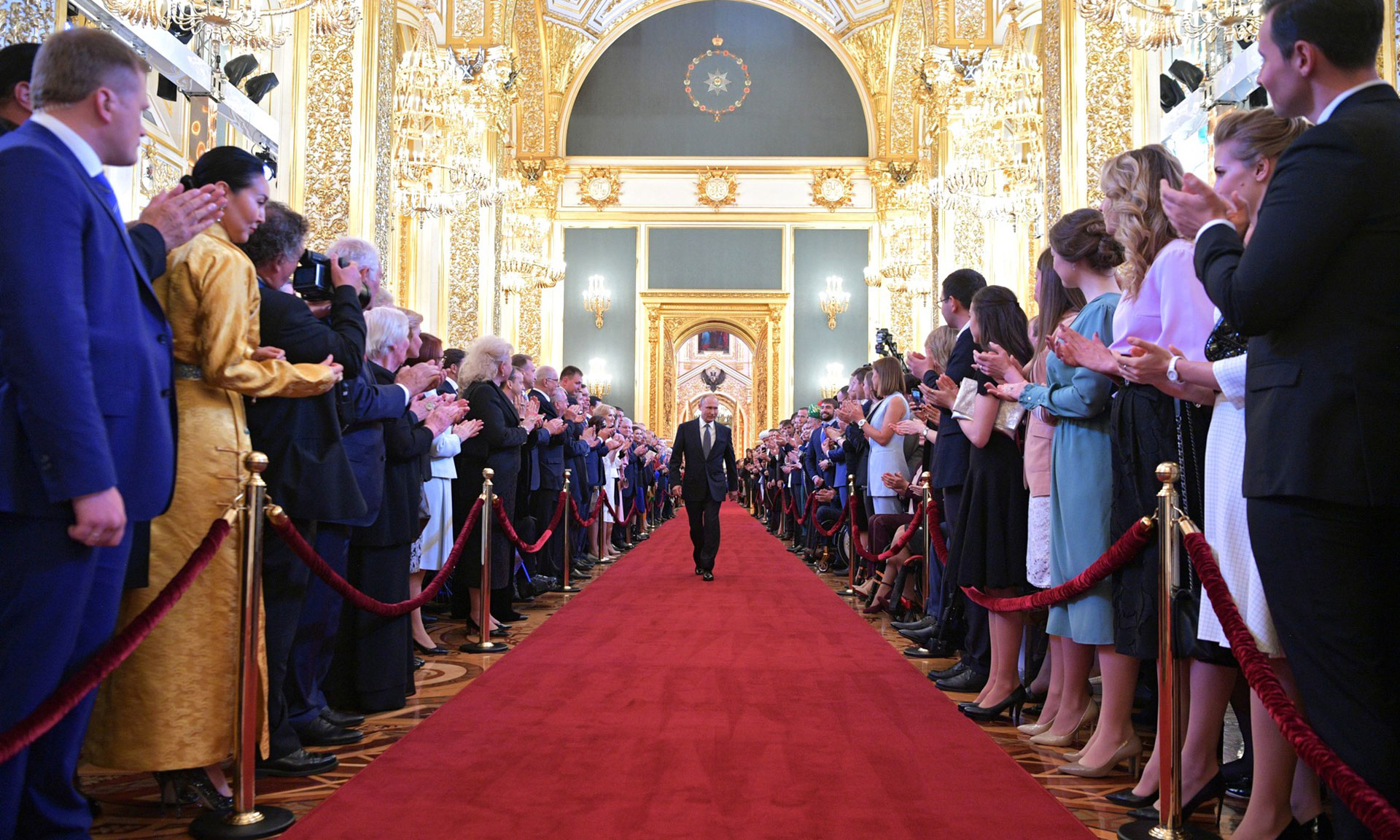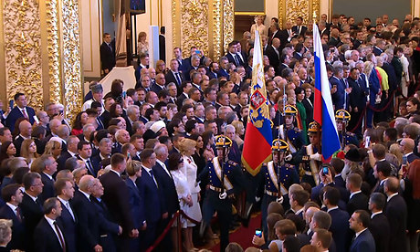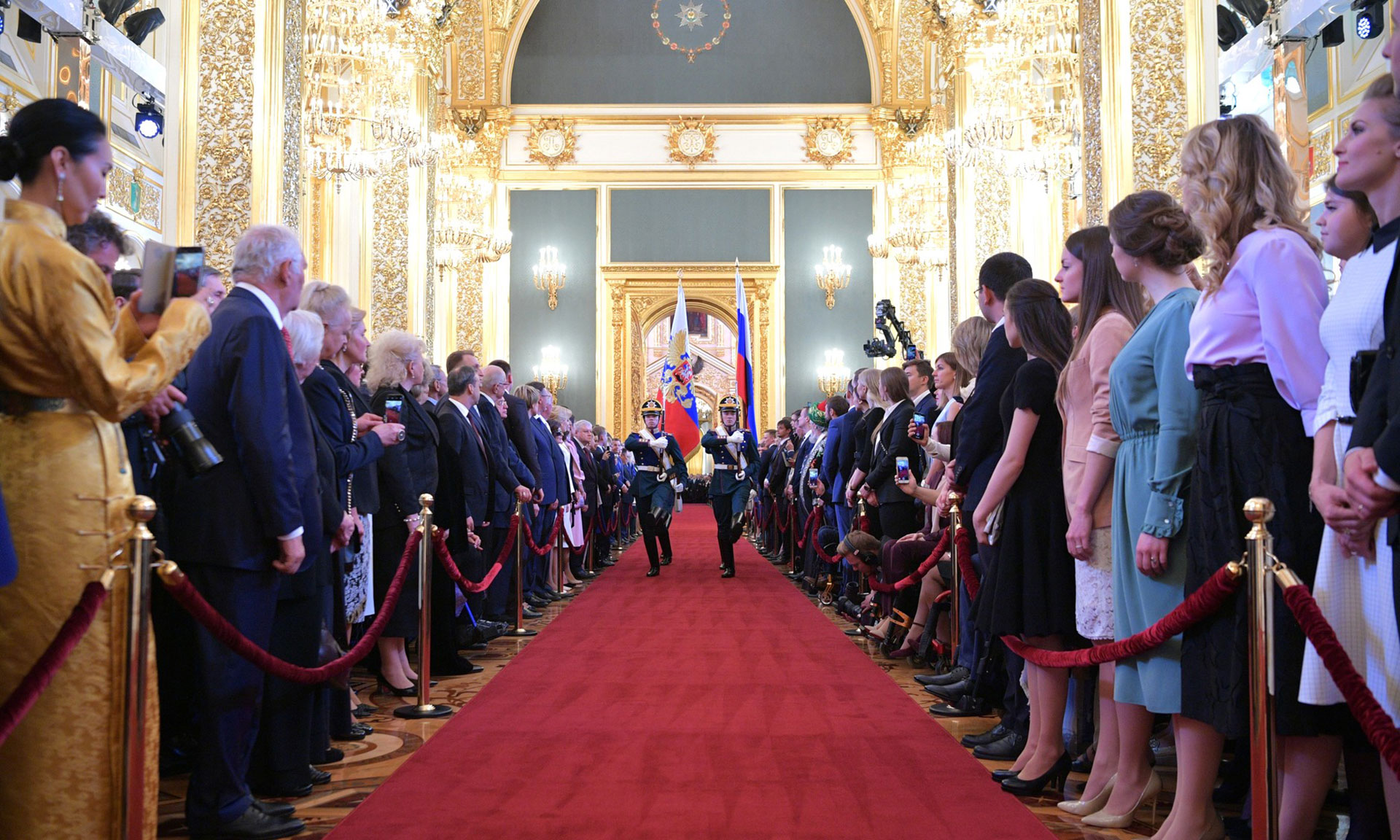 Церемония началась с торжественного внесения Государственного флага России, Штандарта Президента, Конституции России и Знака Президента России в Андреевский зал Большого Кремлевского дворца.