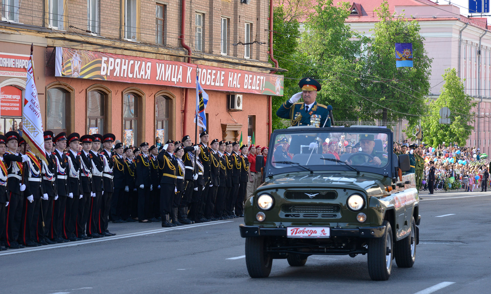 Торжественное шествие принял военный комиссар Брянской области генерал-майор Андрей Соломенцев. Командовал шествием полковник Вячеслав Лазаренко. Во время объезда парадных расчетов войск военный комиссар приветствовал участников торжественного шествия и поздравил с 73-й годовщиной Победы в Великой Отечественной войне.