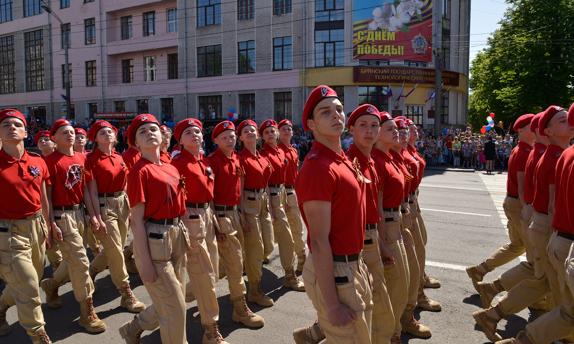 В колонне шествуют: БТР с копией Знамени Победы, УАЗы с главными героями праздника — ветеранами Великой Отечественной войны, знаменная группа с Флагом РФ и копией знамени Победы, оркестр Управления Росгвардии по Брянской области и в/ч 42685, рота барабанщиков кадетского корпуса им. Героя России В. И. Шкурного, ветераны локальных войн и боевых действий, сводные роты ВЧ 41495, Пограничного управления ФСБ России по Брянской области, УФСИН России по Брянской области, управления МЧС России по Брянской области, таможенного управления, судебных приставов, УМВД России по городу Брянску, Росгвардии, ВЧ 42685, роты кадетского корпуса г. Дятьково, кадетского корпуса г. Клинцы, кадетского корпуса г. Стародуба, сводная рота Юнармии, рота школы № 58, представители территориальных органов государственной власти Брянской области, предприятий и организаций, политических партий и общественных движений, трудовые коллективы, жители и гости города.