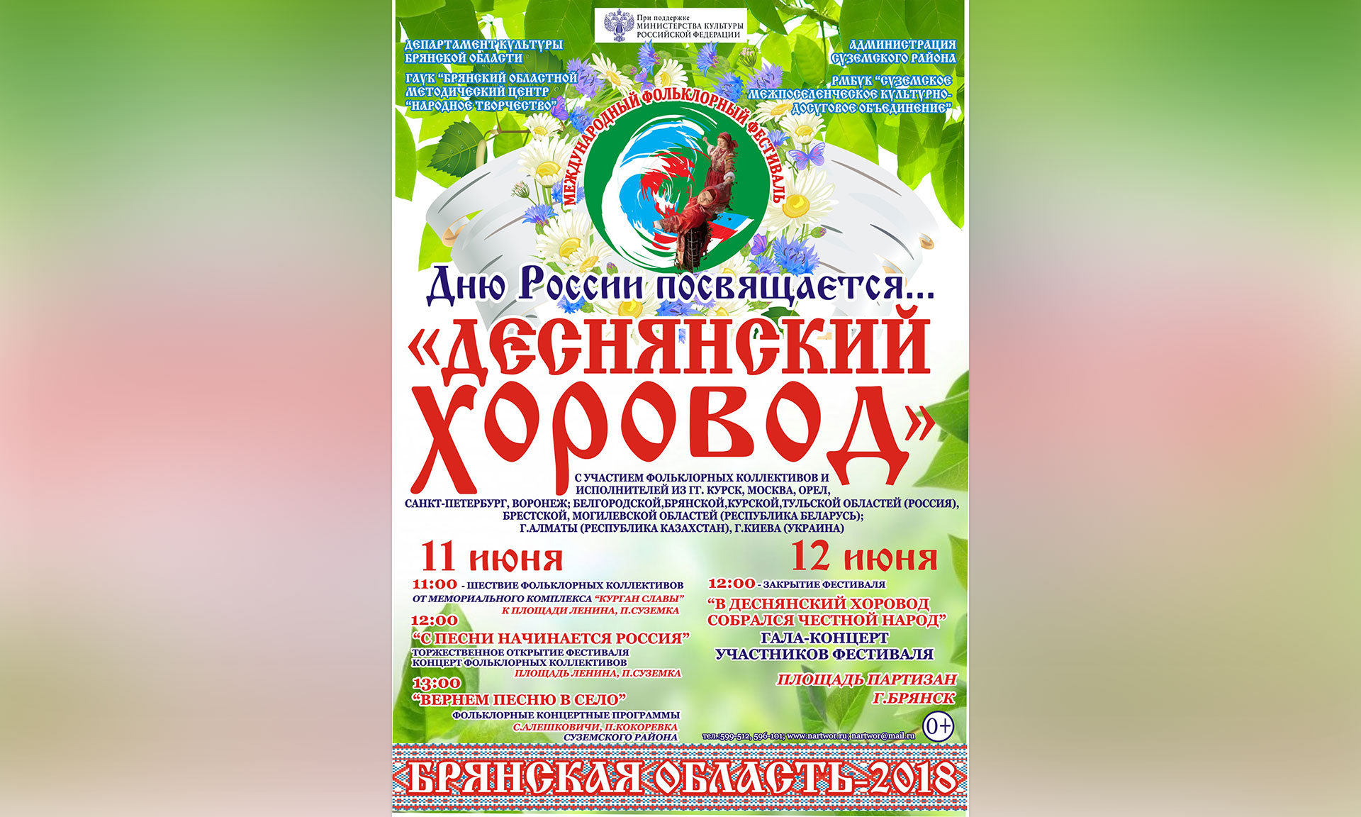 В программе фестиваля: праздничное театрализованное открытие, песенно-обрядовое действо «В Деснянский хоровод собрался честной народ», концертные выступления коллективов в Суземке, селе Алешковичи и поселке Кокоревка Суземского района, шествие фольклорных коллективов и праздничный концерт в Суземке.