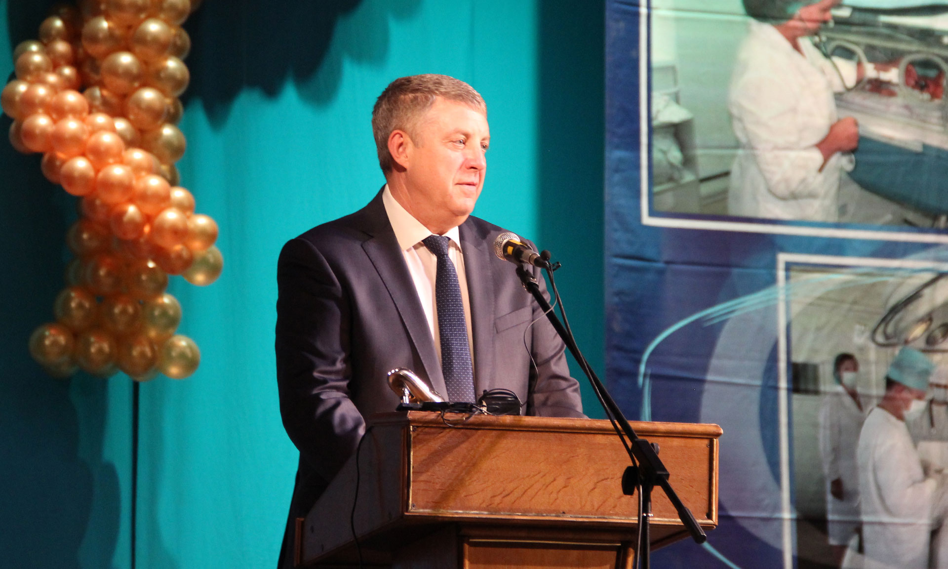 От имени председателя Брянской областной Думы Владимира Попкова и всего депутатского корпуса региона с Днем медицинского работника собравшихся поздравил исполняющий обязанности председателя Брянской областной Думы Анатолий Бугаев: