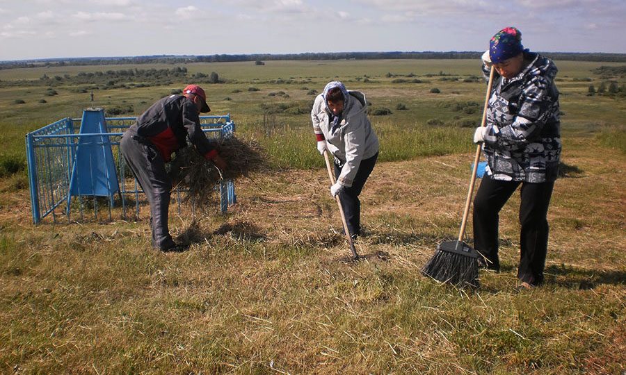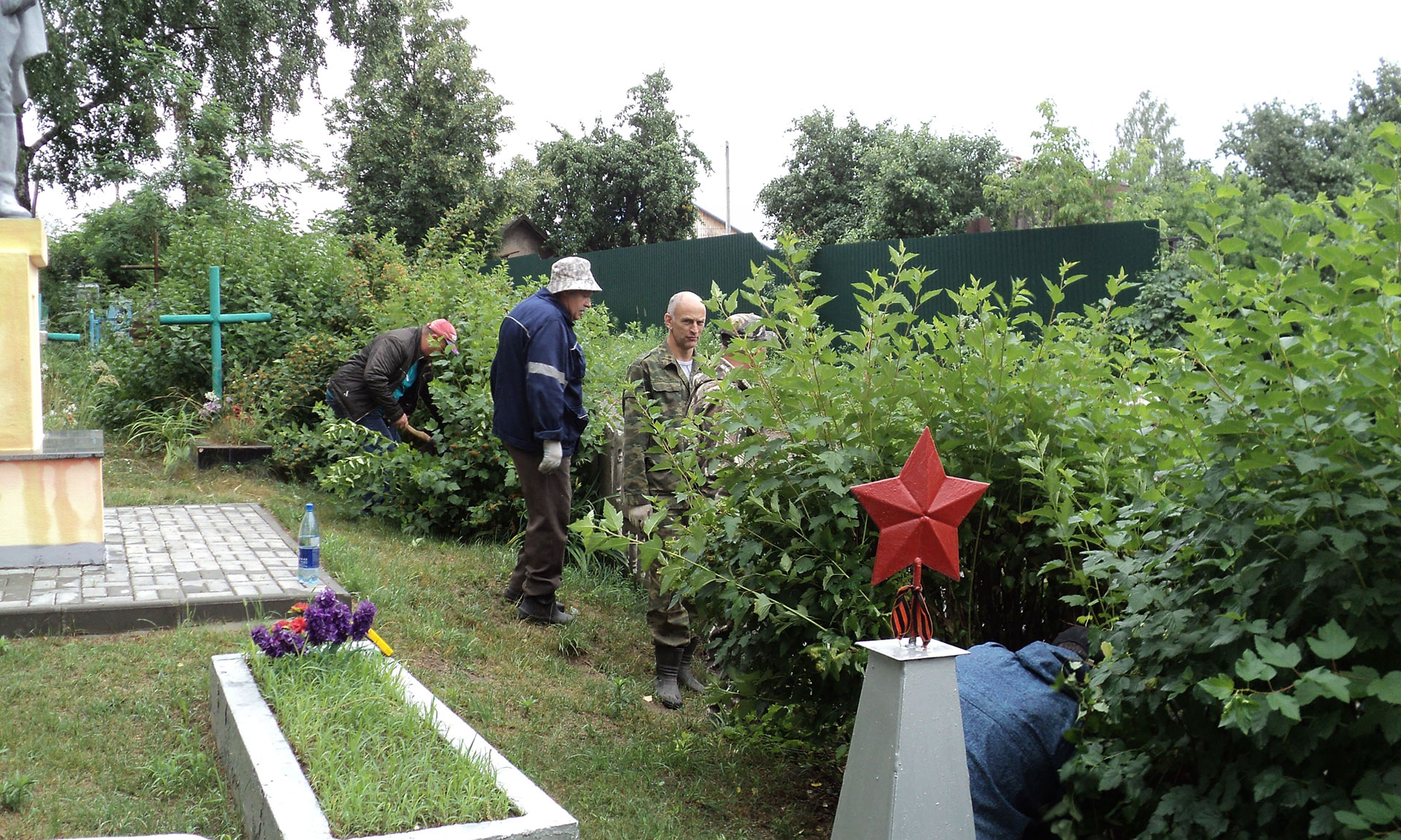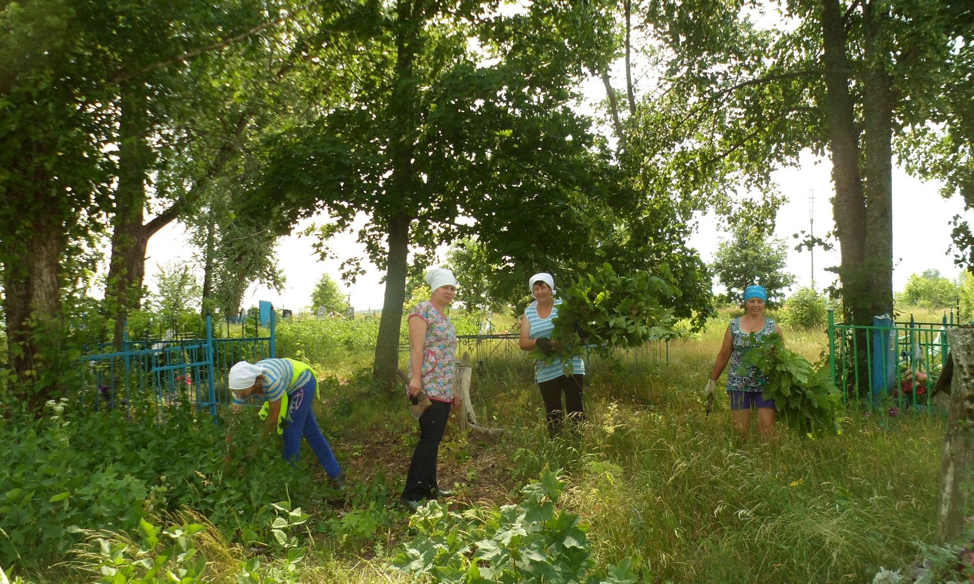 С самого утра работа идет на многих сельских кладбищах, где дело есть для всех. Мужчины вырубают и выпиливают поросли уже этого года, кустарники и выносят ветви. Женщины пропалывают клумбы, приводят в надлежащий вид могилы ветеранов. В целом же, работники организаций и предприятий района убирают прилегающие территории.