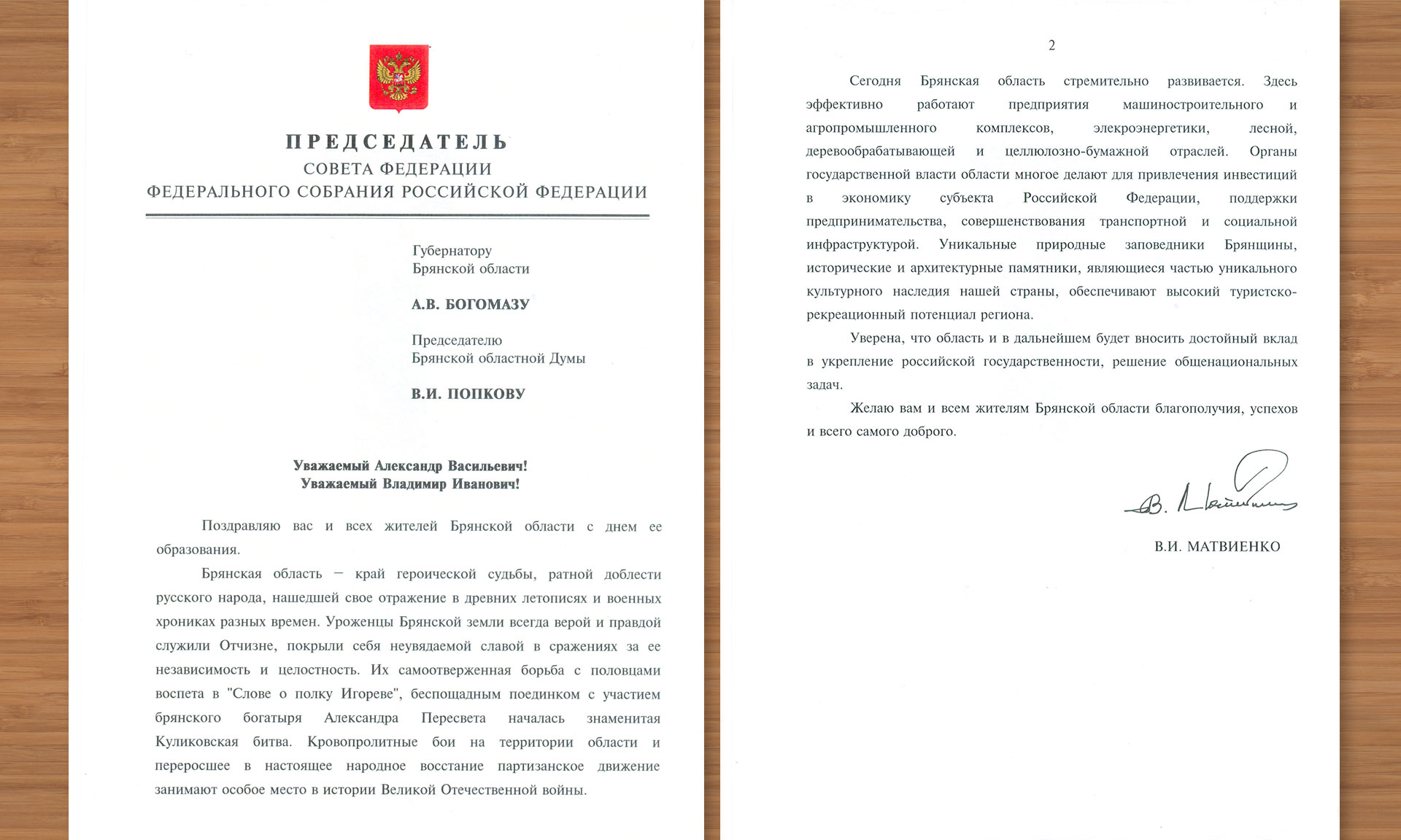 На имя Губернатора Брянской области Александра Богомаза и председателя Брянской областной Думы Владимира Попкова поступило поздравление от председателя Совета Федерации Федерального Собрания РФ Валентины Матвиенко с Днем образования Брянской области.