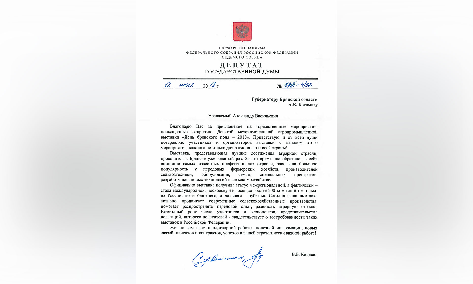 «Уважаемый Александр Васильевич! Благодарю Вас за приглашение на торжественные мероприятия, посвященные открытию Девятой межрегиональной агропромышленной выставки „День брянского поля — 2018“. Приветствую и от всей души поздравляю участников и организаторов выставки с началом этого мероприятия, важного не только для региона, но и всей страны!