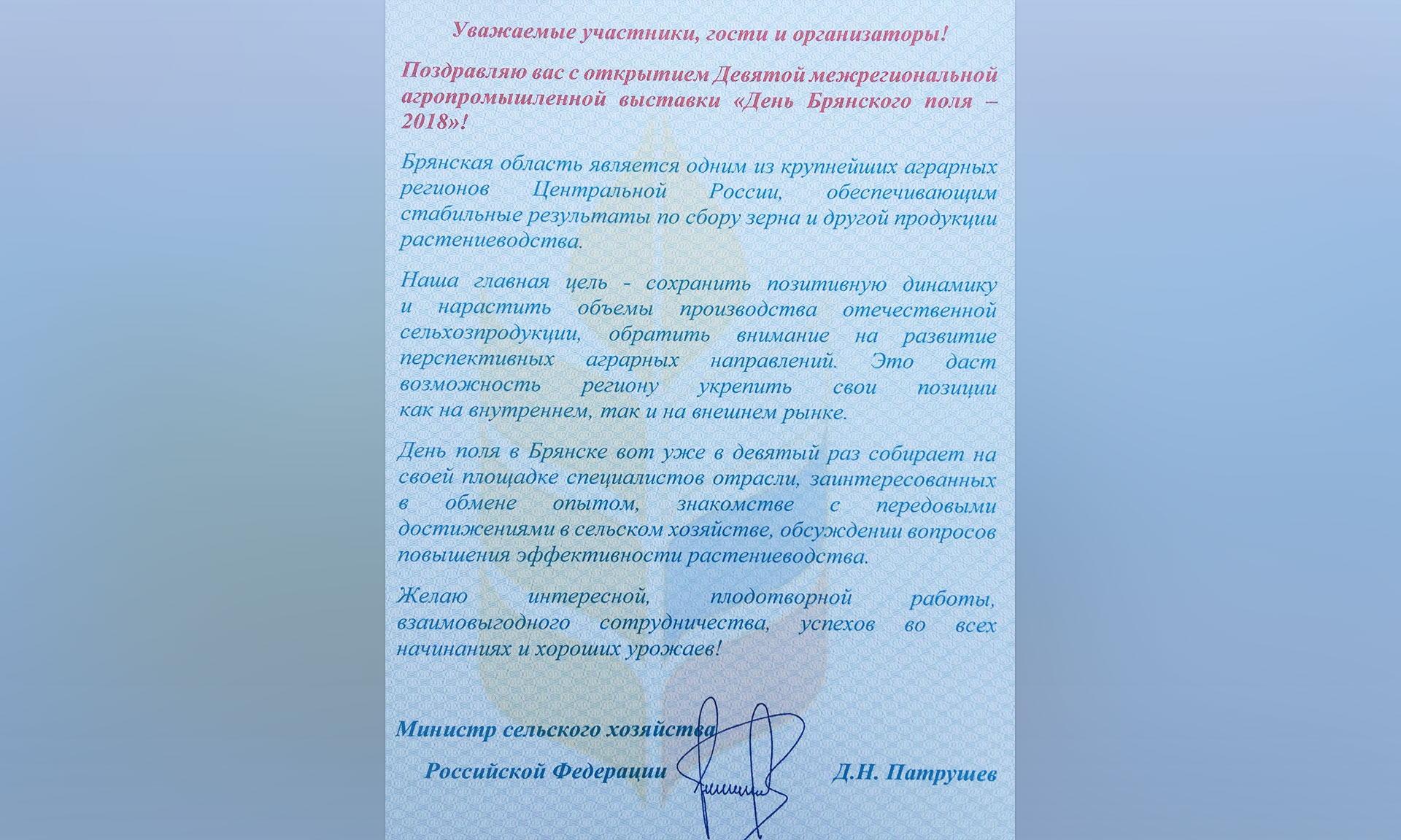 В адрес организаторов и гостей Дня Брянского поля поступило поздравление Министра сельского хозяйства Российской Федерации Дмитрия Патрушева. В нем, в частности, говорится: «Уважаемые участники, гости и организаторы! Поздравляю вас с открытием Девятой межрегиональной агропромышленной выставки „День Брянского поля — 2018“. Брянская область является одним из крупнейших аграрных регионов Центральной России, обеспечивающим стабильные результаты по сбору зерна и другой продукции растениеводства.