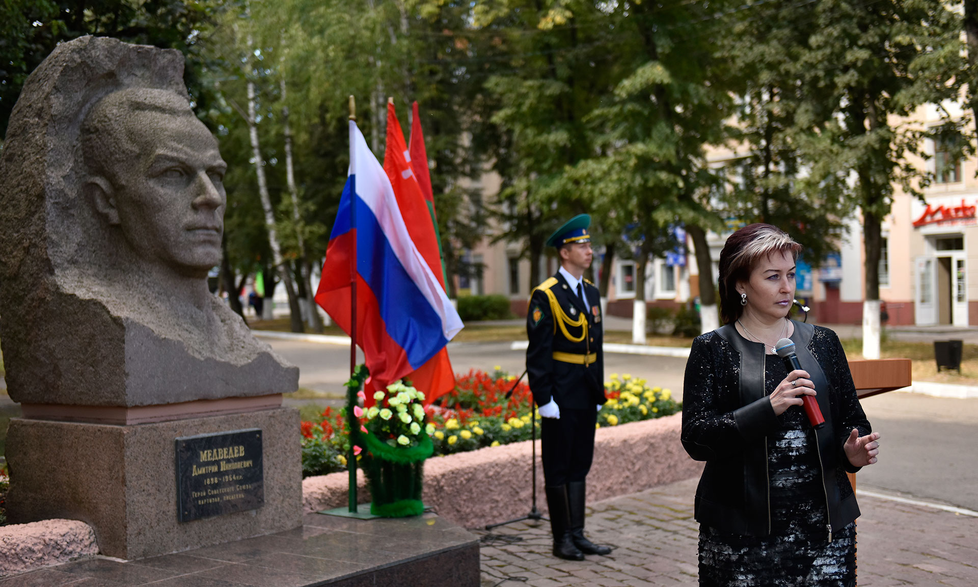 Правительством Брянской области уделяется огромное внимание увековечению памяти героев Брянщины, пропаганде славных страниц истории нашего края. Губернатор Брянской области Александр Васильевич Богомаз уделяет большое внимание патриотическому воспитанию молодежи. Три поколения присутствуют сегодня на митинге: ветераны Великой Отечественной войны, ветераны локальных войн, музейные работники и юные жители города Брянска — внуки и правнуки Героя. Я надеюсь, что нашими общими усилиями память о подвигах Дмитрия Николаевича Медведева и всех тех, кому мы обязаны жизнью и мирным небом над головой, будет храниться вечно.