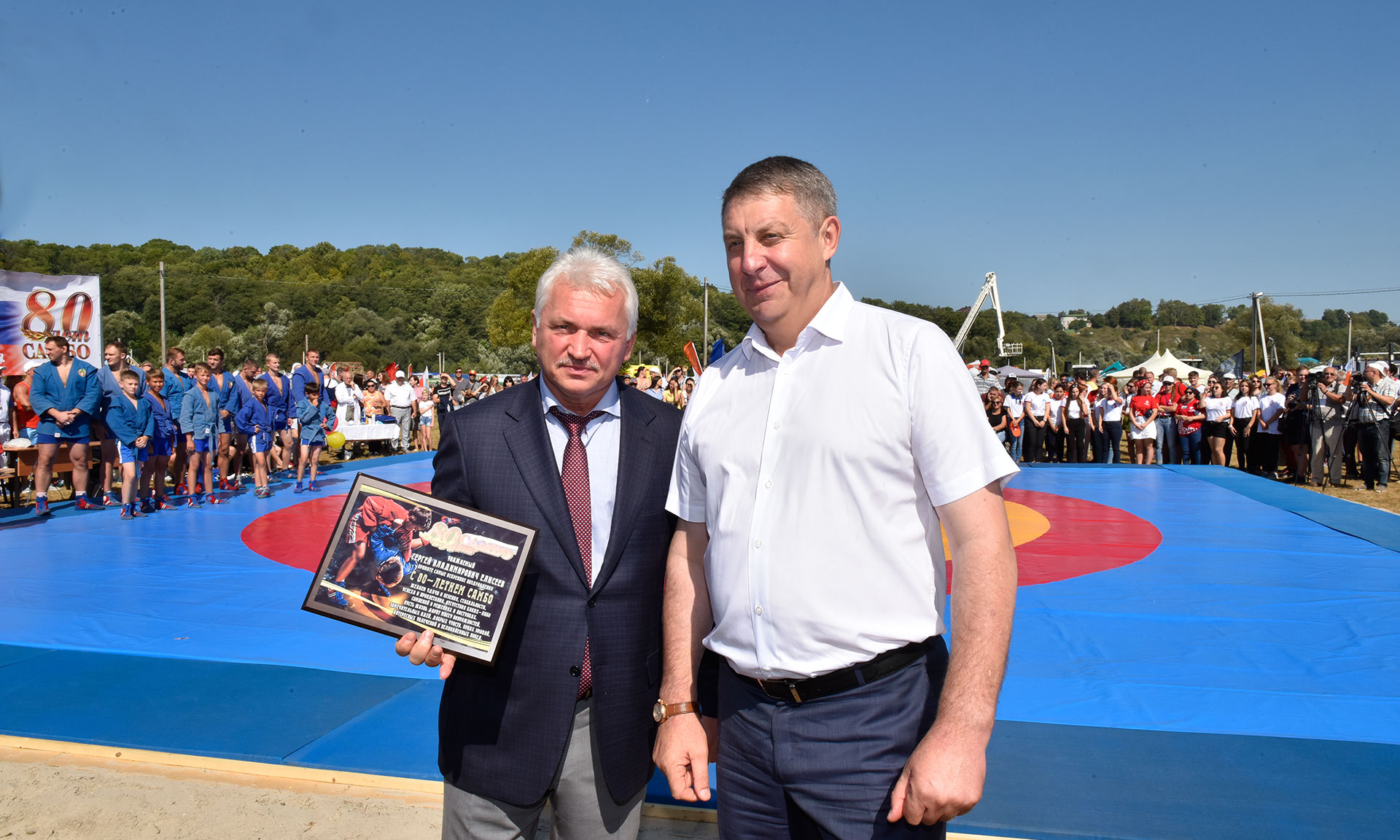 В знак особой признательности Губернатор Александр Богомаз и президент Всероссийской и Европейской федерации самбо Сергей Елисеев отметили лучших брянских самбистов и вручили им памятные плакетки в честь 80-летия со дня образования самбо. Первую плакетку глава региона подарил президенту Всероссийской и Европейской федерации самбо, также они были вручены Отару Кацанашвили, Владимиру Сивакову, Виктору Полтеву, Юрию Ремизову, Александру Елисееву, Алексею Савченко, Владимиру Клименченко, Владимиру Костаганову, Сергею Портнову, Юрию Нежлукченко, Игорю Михалину, Александру Терешку, Сергею Хотмирову, Валерию Сафонову, Владимиру Зеничеву, Анатолию Зеничеву.