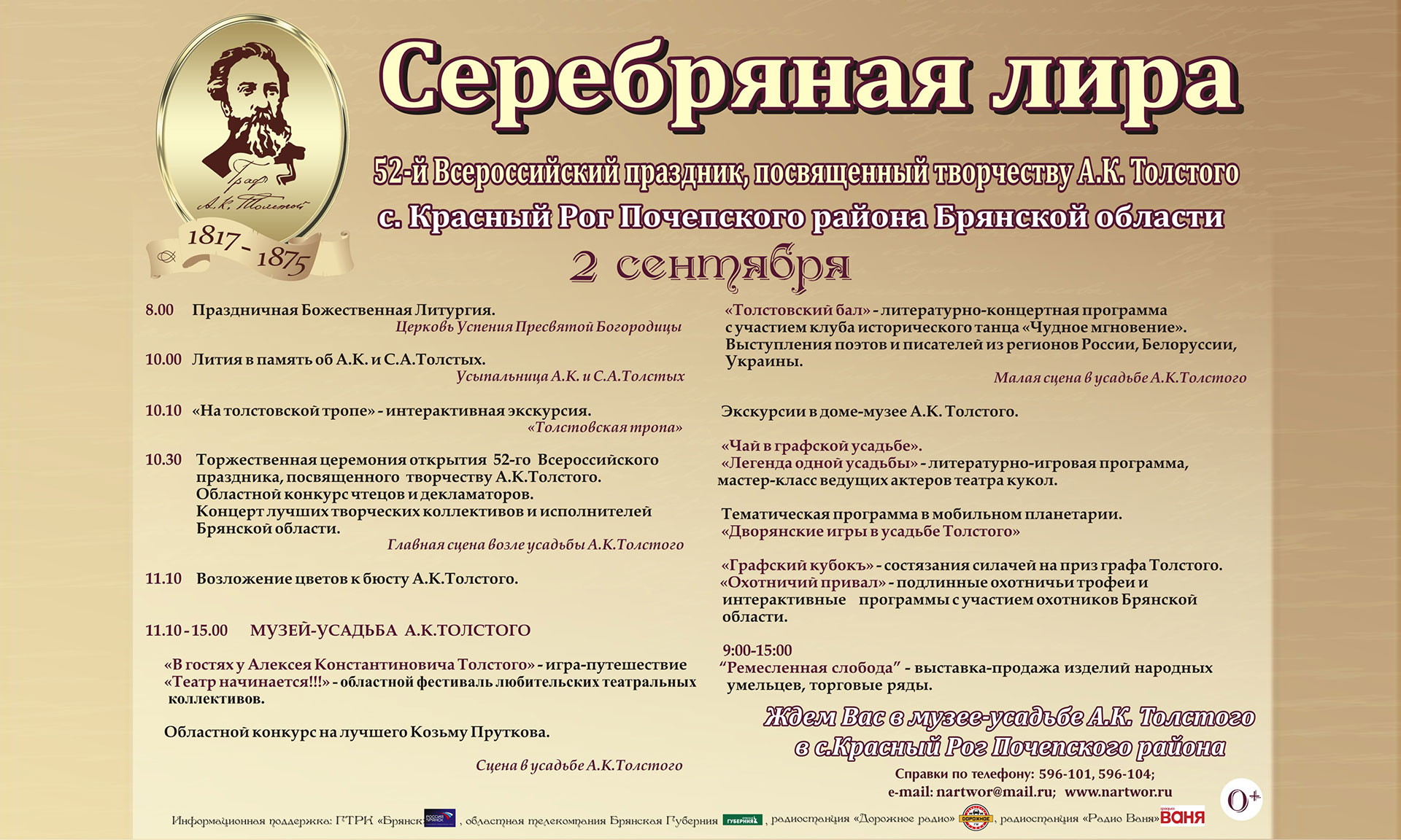 Просторы единственной сохранившейся родовой усадьбы Алексея Толстого ежегодно встречают почитателей его таланта, которые приезжают сюда вновь и вновь, чтобы приобщиться к атмосфере, вдохновлявшей его в творчестве. Почетные гости, писатели и поэты Брянщины, а также из регионов России, Беларуси, Украины совершат экскурсию, пройдя по «Тропе поэта, примут участие в торжественной церемония открытия 52-го Всероссийского праздника «Серебряная Лира».