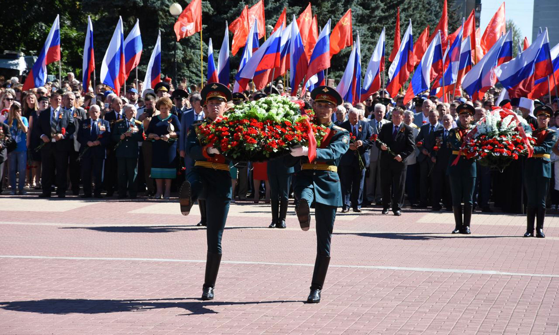 Торжества на мемориальном комплексе «Курская дуга» начались с возложения венков и корзин с цветами к могиле Неизвестного Солдата, памятнику маршалу Советского Союза Георгию Жукову и стеле «Курск — город воинской славы».