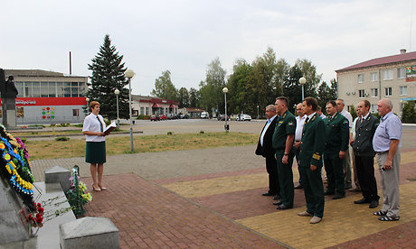 Участники открытия кордона лесника почтили память погибших в Великой Отечественной войне, возложив цветы у памятной стелы, установленной в честь присвоения пгт. Клетня звания «Посёлок партизанской славы».