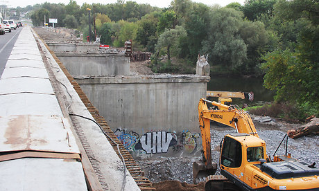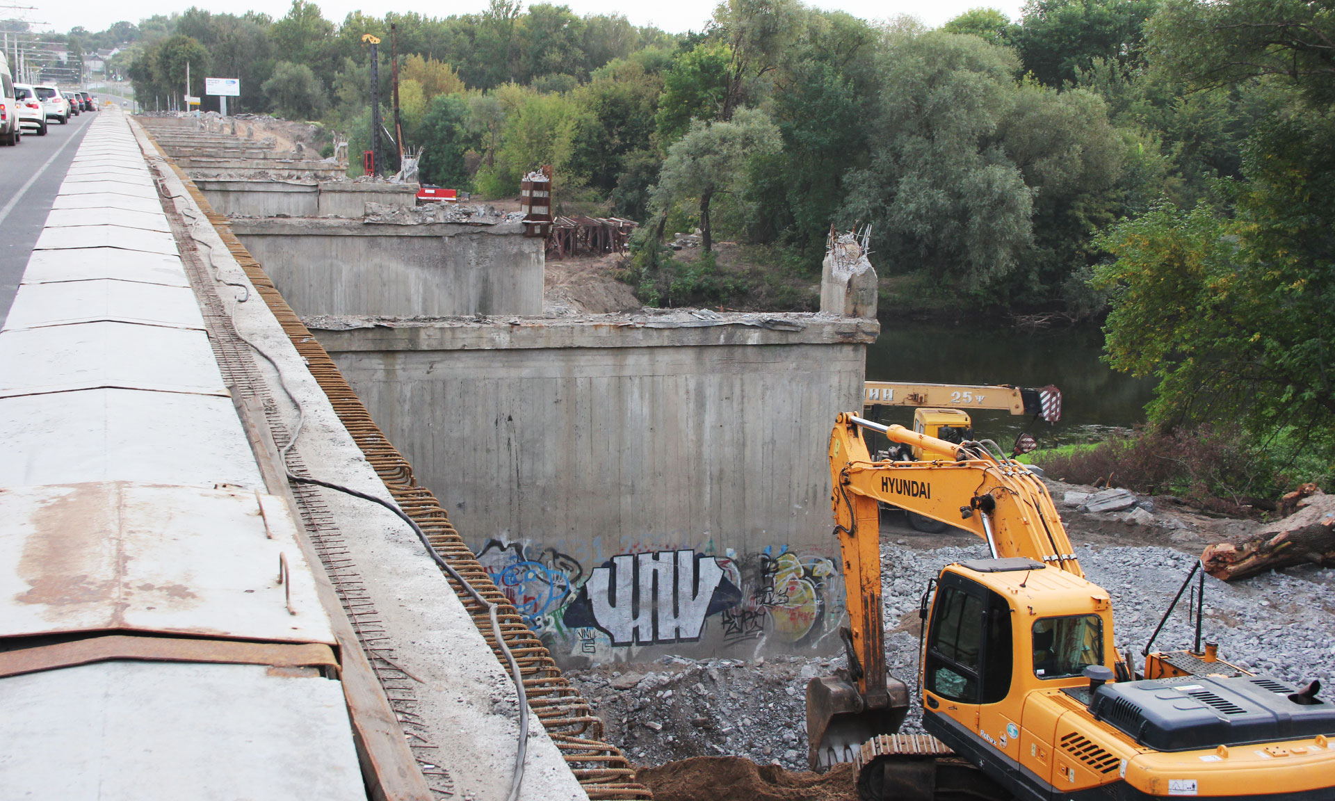 Уже выполнены работы по разборке существующих конструкций моста, демонтировано асфальтобетонное покрытие на мосту, опоры освещения, барьерное и перильное ограждение, балки пролетных строений (12 пролетов), проводятся работы по реконструкции опор со стороны Советского района, произведено погружение 153 свай под устройство новых ростверков. Параллельно ведутся работы по устройству временного моста через реку Десну — эта работа весьма трудоемкая, конструкцию будут готовить еще около месяца.