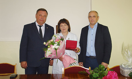 Врио заместителя Губернатора Брянской области Владимир Оборотов и первый заместитель директора департамента здравоохранения Брянской области Виталий Мосин в торжественной обстановке вручили главному врачу ГАУЗ «Брянская городская больница № 4» Светлане Хандожко высокую награду.