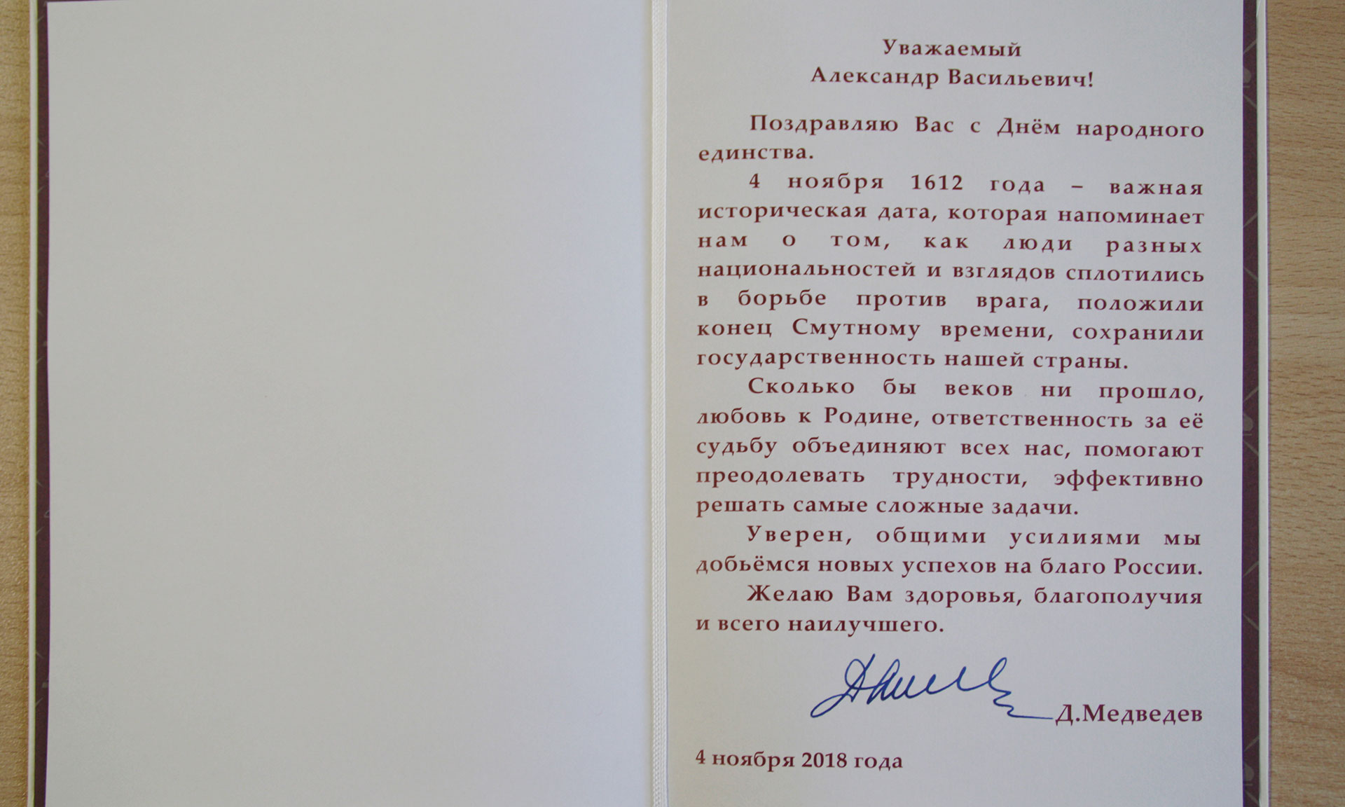 Уверен, общими усилиями мы добьемся новых успехов на благо России. Желаю Вам здоровья, благополучия и всего наилучшего».