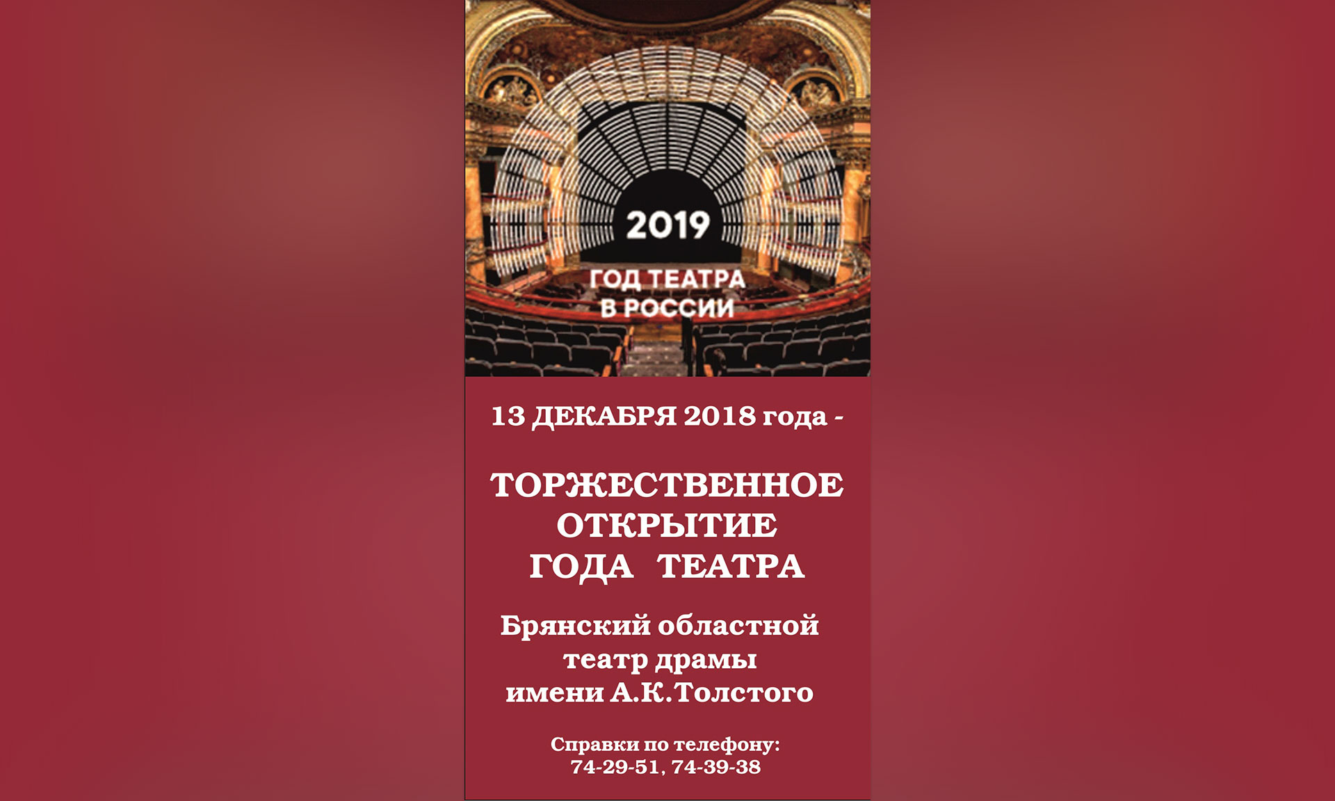 13 декабря 2018 года во всех регионах Российской Федерации состоится торжественное открытие Года театра, объявленного Президентом Российской Федерации Владимиром Путиным.