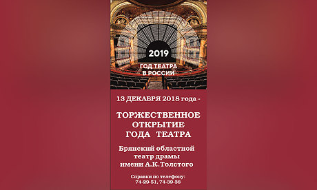 Одним из центральных событий торжественного открытия в Брянской области Года театра в России станет праздничный вечер в Брянском областном театре драмы им. А. К. Толстого 13 декабря в 17.00, который объединит руководителей Брянской области, органов местного самоуправления, известных деятелей театрального искусства, руководителей и участников любительских театральных коллективов, студенческих и школьных театров
