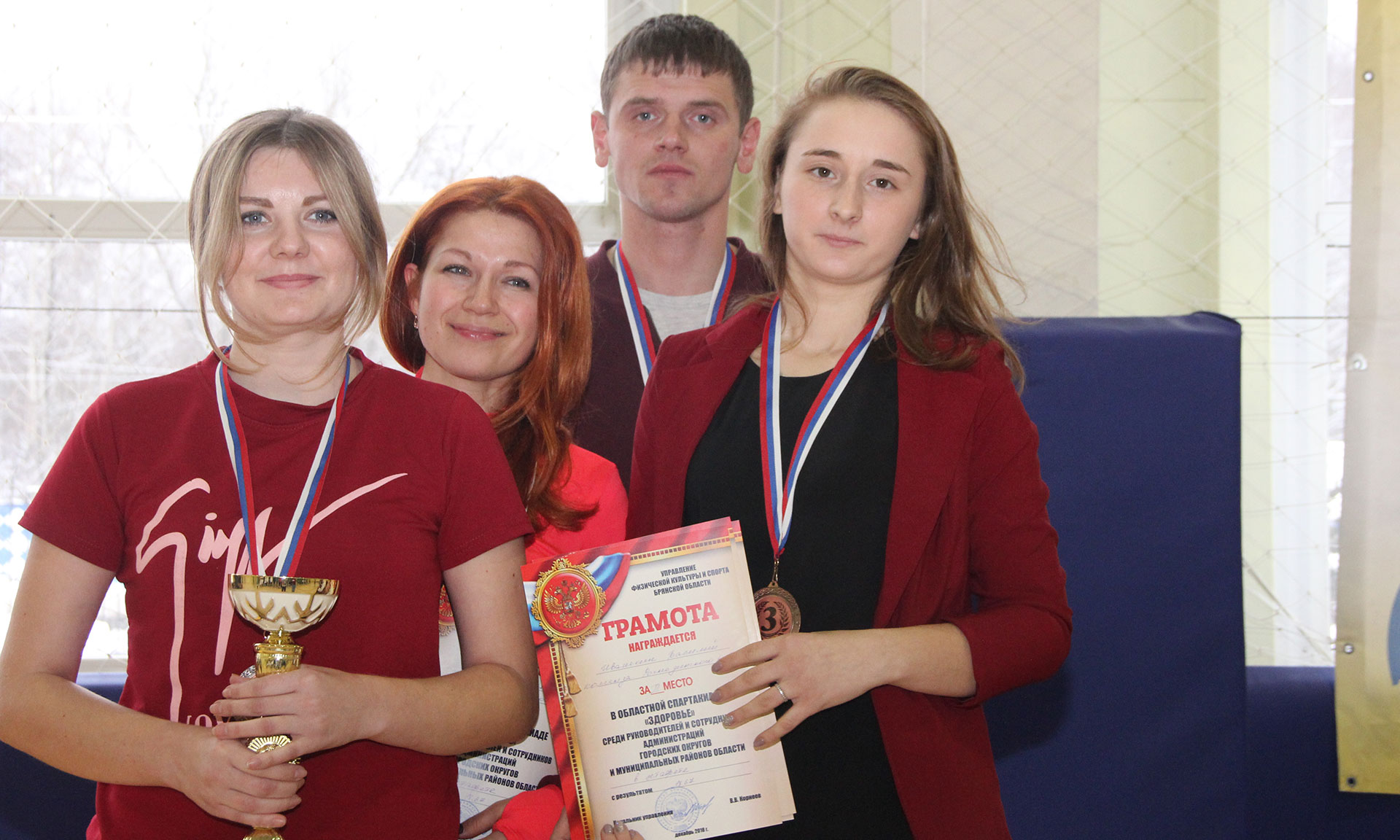 15 декабря управлением физической культуры и спорта Брянской области была проведена спартакиада «Здоровье» среди руководителей и сотрудников администраций городских округов и муниципальных районов области, депутатского корпуса, органов местного самоуправления в рамках реализации плана мероприятий по поэтапному внедрению Всероссийского физкультурно-спортивного комплекса «Готов к труду и обороне» (ГТО) в Брянской области.
