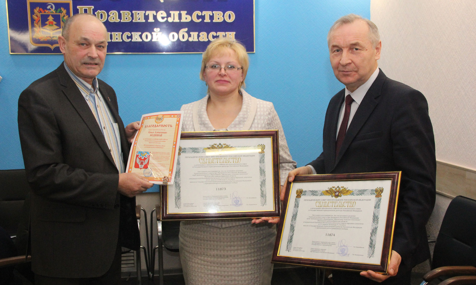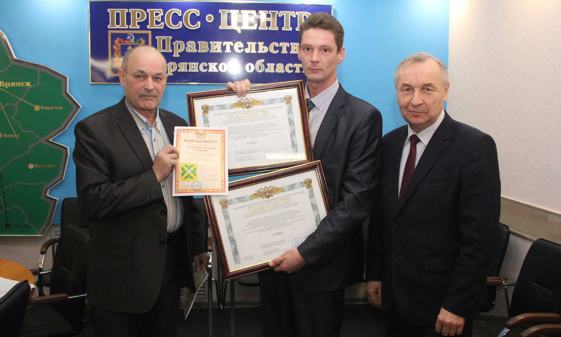 В подтверждение активизации работы муниципальных образований на заседании геральдического совета были вручены свидетельства о регистрации герба и флага в Государственном геральдическом регистре Российской Федерации: городскому округу Новозыбков, Овстугскому сельскому поселению Жуковского района, Игрицкому, Быховскому, Лопандинскому сельским поселениям Комаричского района. Благодарности Союза геральдистов России за содействие в создании герба и флага главам муниципальных образований удостоены: Ольга Кодина, Виктор Пахомов, Александр Рогозин, Александр Матвеенко.