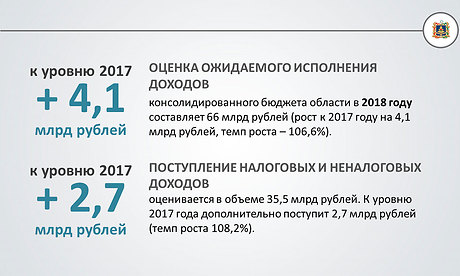 Оценка ожидаемого исполнения доходов консолидированного бюджета области в 2018 году составляет 66 млрд рублей (рост к 2017 году — на 4,1 млрд рублей, темп роста — 106,6%). Поступление налоговых и неналоговых доходов оценивается в объеме 35,5 млрд рублей. К уровню 2017 года дополнительно поступило 2,7 млрд рублей. Это говорит о том, что экономика региона поступательно развивается.