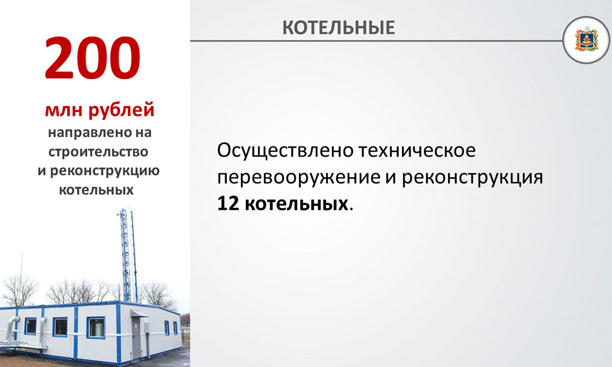— Мы неоднократно обсуждали вопрос о замене устаревших котельных. В 2018 году направили 200 млн рублей на строительство и реконструкцию котельных ГУП «Брянсккоммунэнерго». Это позволило осуществить техническое перевооружение и реконструкцию 12 морально устаревших котельных.