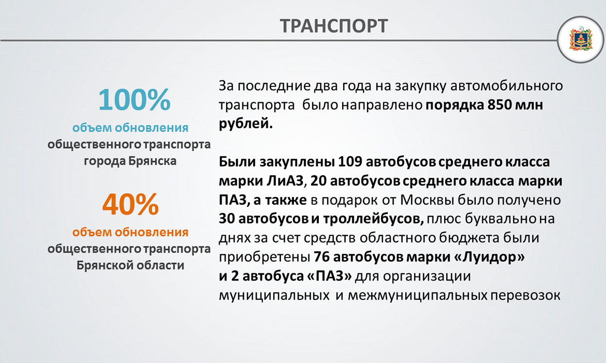 — Если раньше муниципальный транспорт доживал свой век, а на городских улицах хозяйничали малогабаритные маршрутки, то сегодня ситуация кардинально изменилась. За последние два года — 2017 и 2018 — на закупку автомобильного транспорта мы направили порядка 850 млн рублей. Это 109 автобусов среднего класса марки ЛиАЗ и 20 автобусов среднего класса марки ПАЗ, которые значительно улучшили ситуацию с пригородными перевозками. Мы получили в подарок от Правительства Москвы 30 автобусов и троллейбусов. Да, это, скажем так, не новый транспорт, но он лучше некоторого, что имеет Брянск.