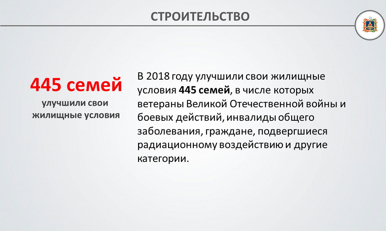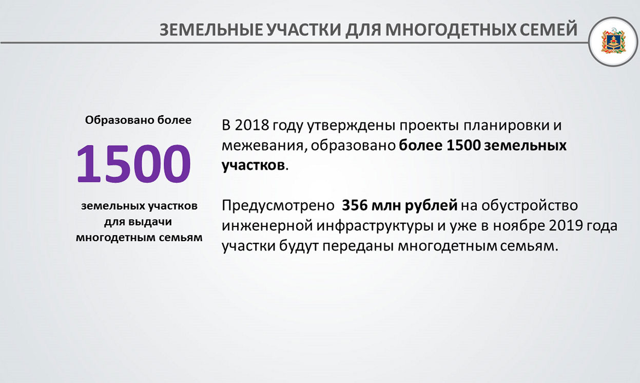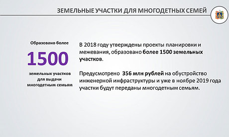 В 2018 году утверждены проекты планировки и межевания, образовано более 1500 земельных участков. Предусмотрено 356 млн рублей на обустройство: 171 млн рублей — на дороги и 185 млн рублей — на инженерную инфраструктуру. Многодетные семьи получат участки, которые будут полностью обеспечены инфраструктурой. Уже в следующем году они будут переданы многодетным семьям. Это конкретный пример реальной заботы о будущем наших граждан, и так должно быть в каждом муниципальном образовании, каждый руководитель района должен понимать свою ответственность за поддержку семьи.