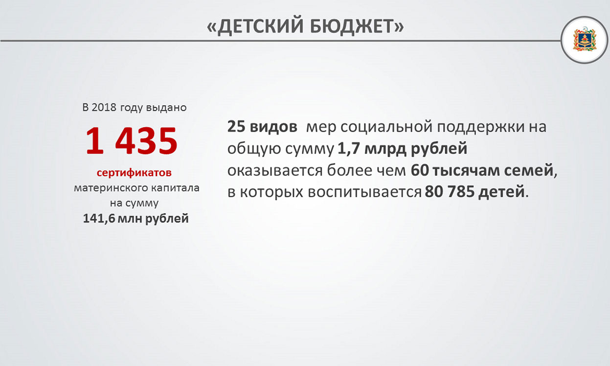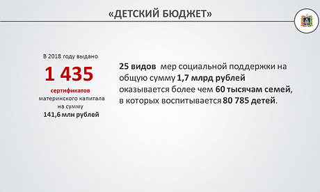В Брянской области есть такой мощный инструментарий, как «детский бюджет». 25 видов мер социальной поддержки на общую сумму 1,7 млрд рублей оказывается более чем 60 тысячам семей, в которых воспитывается 80 785 детей. Региональный материнский капитал с 1 января 2015 года увеличен с 50 до 100 тысяч рублей. С начала 2018 года выдано 1 435 сертификатов, распорядились средствами областного материнского (семейного) капитала 678 семей на общую сумму 67,8 млн рублей.