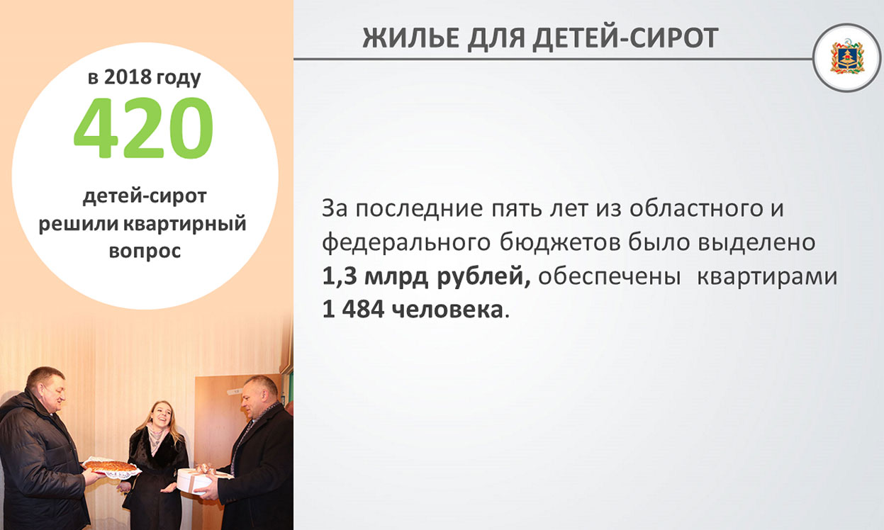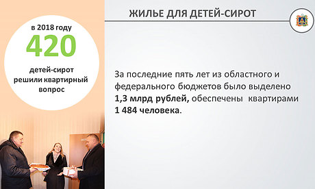 — Мы уже много говорили на эту тему, тенденция у нас положительная. Если раньше выделялось мало средств, мы имеем очередь, но с такими темпами финансирования, которые сейчас есть, мы должны ее «развести» в ближайшие пять лет. В этом году мы выделили 420 квартир для детей-сирот, а всего за 4 года было выделено 1,3 млрд рублей, обеспечено квартирами 1 484 ребенка.