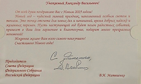 В адрес Губернатора Брянской области Александра Богомаза поступила поздравительная открытка от Председателя Совета Федерации Федерального Собрания Российской Федерации Валентины Матвиенко.