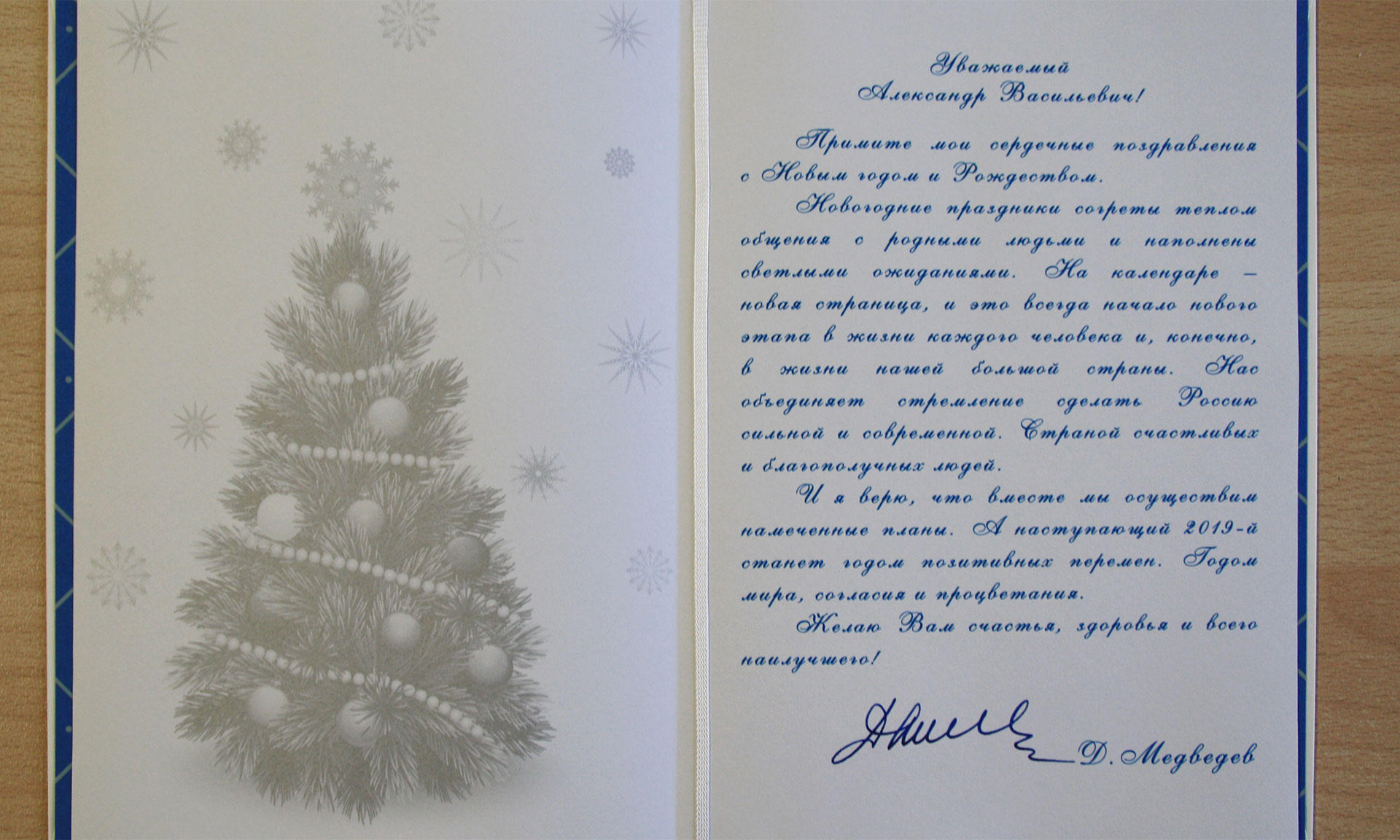 Примите мои сердечные поздравления с Новым годом и Рождеством. Новогодние праздники согреты теплом общения с родными людьми и наполнены светлыми ожиданиями. На календаре — новая страница, и это всегда начало нового этапа в жизни каждого человека и, конечно, в жизни нашей большой страны. Нас объединяет стремление сделать Россию сильной и современной. Страной счастливых и благополучных людей.