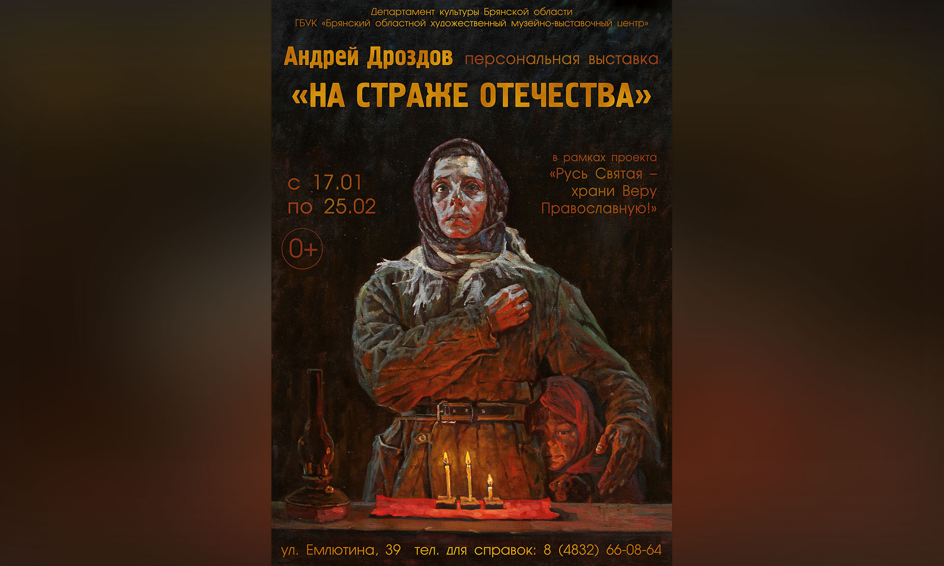 17 января в 16.00 в Брянске, в ГБУК «Брянский областной художественный музейно-выставочный центр» по ул. Емлютина, 39 откроется персональная выставка работ Андрея Дроздова (г. Москва), в рамках передвижного выставочного проекта «Русь святая — храни веру православную!».