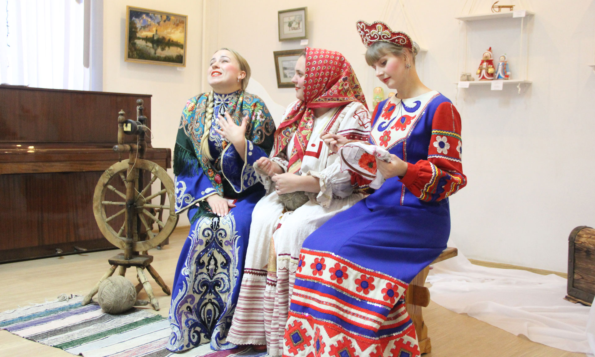 Открытие выставки «Народные сказки руками мастеров» началось с театрализованного представления в исполнении творческого коллектива центра «Народное творчество» и солисток народного фольклорного ансамбля «Макоша».