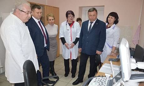 В ходе посещения районной поликлиники заместитель Губернатора Владимир Оборотов и директор департамента здравоохранения Андрей Бардуков зашли в кабинет УЗИ, в котором совсем недавно установлен новый аппарат ультразвуковой диагностики. Врач Казбек Калоев рассказал о его возможностях, отметив, что по сравнению с предыдущим аппаратом у этого уже больше различных функций.