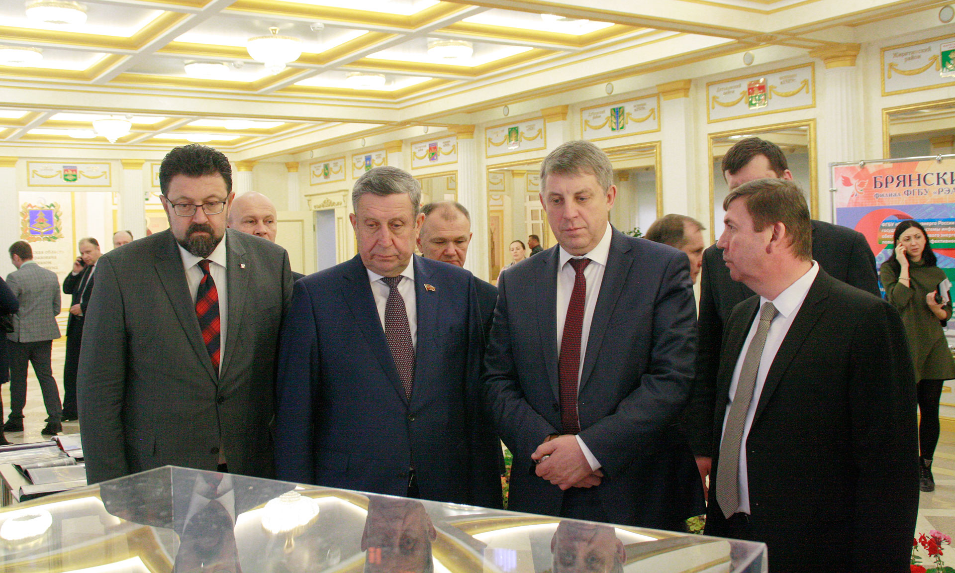 Перед началом мероприятия гости смогли ознакомиться с выставкой, развернутой в фойе Хрустального зала Правительства Брянской области, темой которой стала «Реализация Национальных проектов „Формирование комфортной городской среды“ и „Чистая вода“».