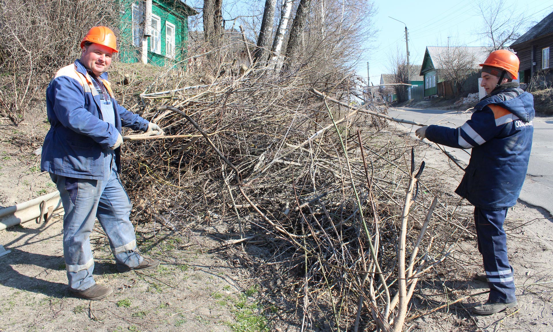 Сотрудники ООО «Газтеплосервис» вырубают мелкий кустарник вдоль улицы Мира на Покровщине.