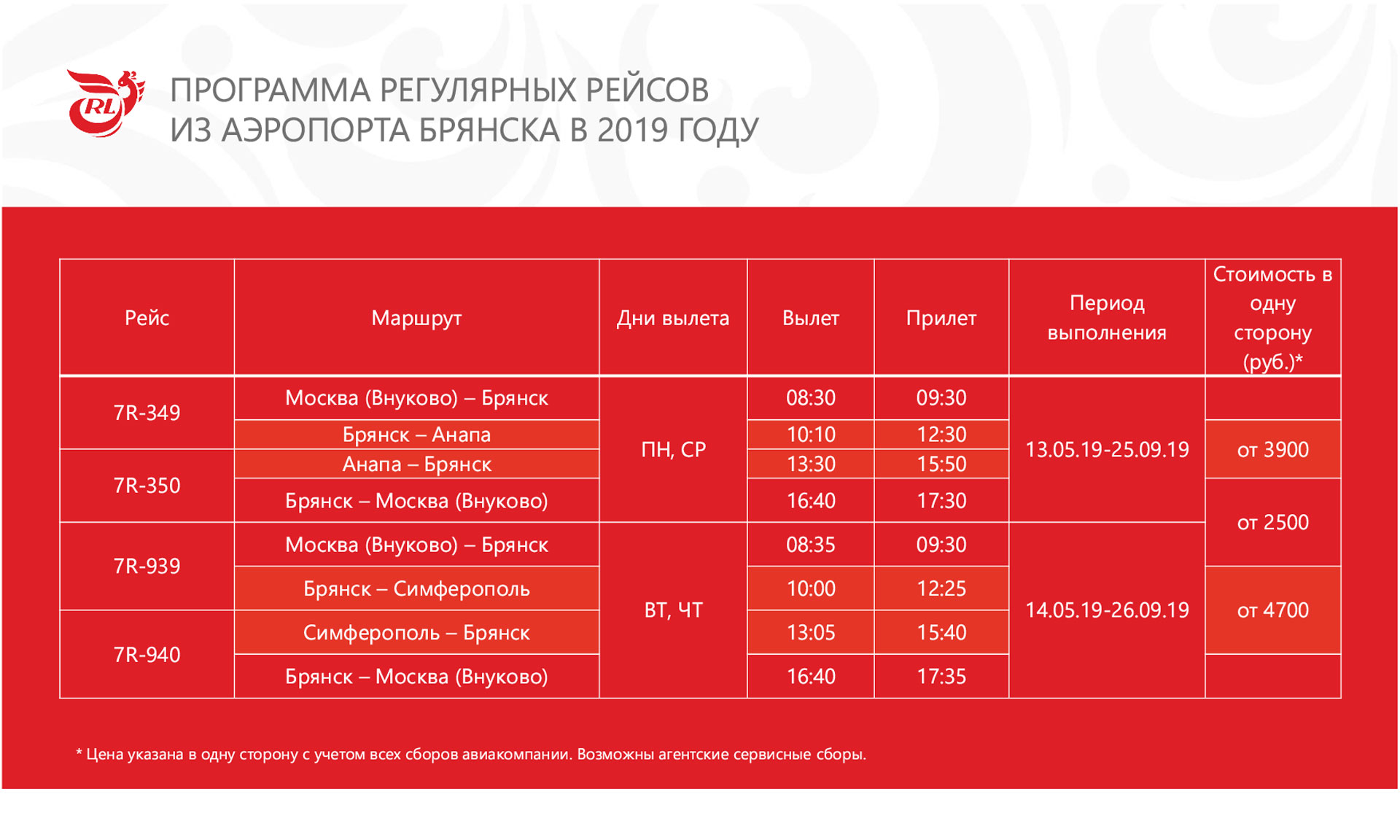Итак, 13 мая отправляется первый рейс авиакомпании «РусЛайн» из Брянска в Анапу, 14 мая — в Симферополь, в эти же дни открываются рейсы в Москву. Стоимость билета на рейс из Брянска до Москвы — от 2500 рублей, в Анапу — от 3900 рублей, Симферополь — от 4700 рублей (подробное расписание рейсов и стоимость билетов — на сайте авиакомпании).