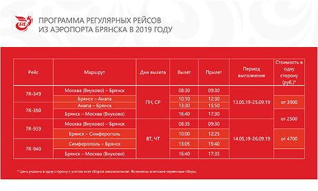 С начала года авиакомпания S7 продолжает выполнять два раза в неделю полеты в Санкт-Петербург, с 4 мая — трижды в неделю. С 4 мая из Брянска можно будет совершить путешествие на главный курорт Черноморского побережья России — город Сочи. Рейсы станут еженедельными, по вторникам и субботам.
