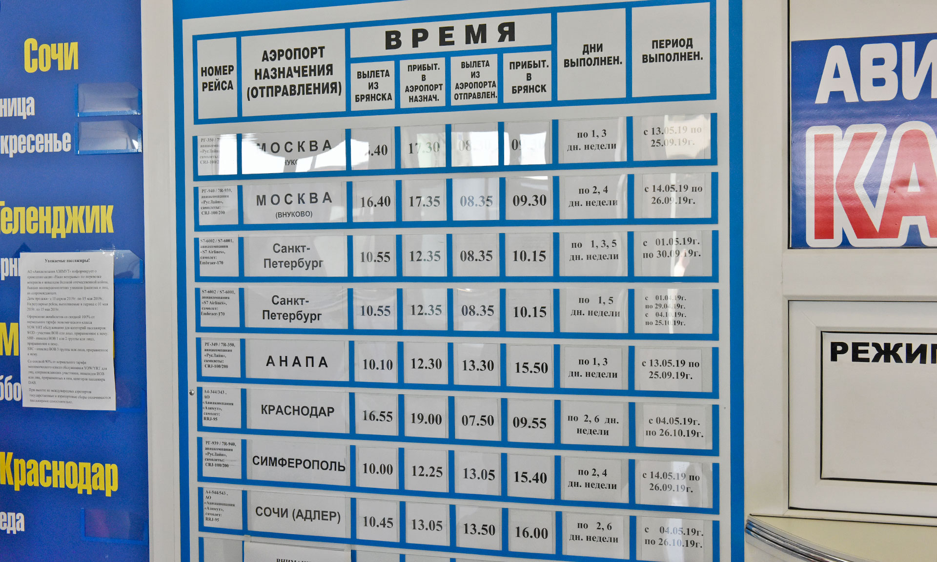 С начала года авиакомпания S7 продолжала выполнять два раза в неделю полеты в Санкт-Петербург, с 4 мая — трижды в неделю. С 4 мая из Брянска можно совершить путешествие с компанией «Азимут» на главный курорт Черноморского побережья России — город Сочи. Рейсы еженедельные, по вторникам и субботам.