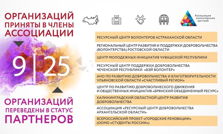 Было принято решение о включении в состав Ассоциации волонтерских центров 9 новых членов, в числе которых Центр по развитию добровольческого движения и общественных инициатив ГАУ «Брянский объединенный ресурс». Брянская область стала еще одним регионом, в котором Ассоциация волонтерских центров начала вести работу.