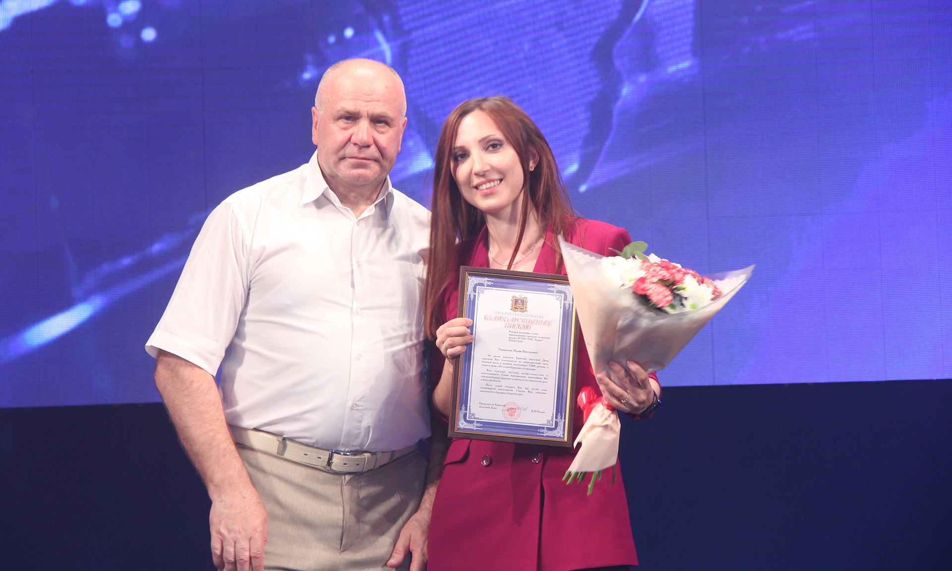 Особые слова благодарности хотел бы выразить руководителю — Галине Ивановне Тихомировой, которая умело ведет за собой коллектив телерадиокомпании, вдохновляя сотрудников на эффективную работу. Компания одной из первых в Центральном федеральном округе начала вещание в цифровом формате. «Цифра» дала не только отличное качество картинки и звука, но и расширила зрительскую аудиторию, которая вправе рассчитывать на профессиональные, объективные сюжеты. Надо отметить, что ваш слаженный, талантливый коллектив принял этот вызов, и уже сегодня работа брянских телерадиожурналистов получает высокую оценку профессионального сообщества и, что самое главное, ваших зрителей.