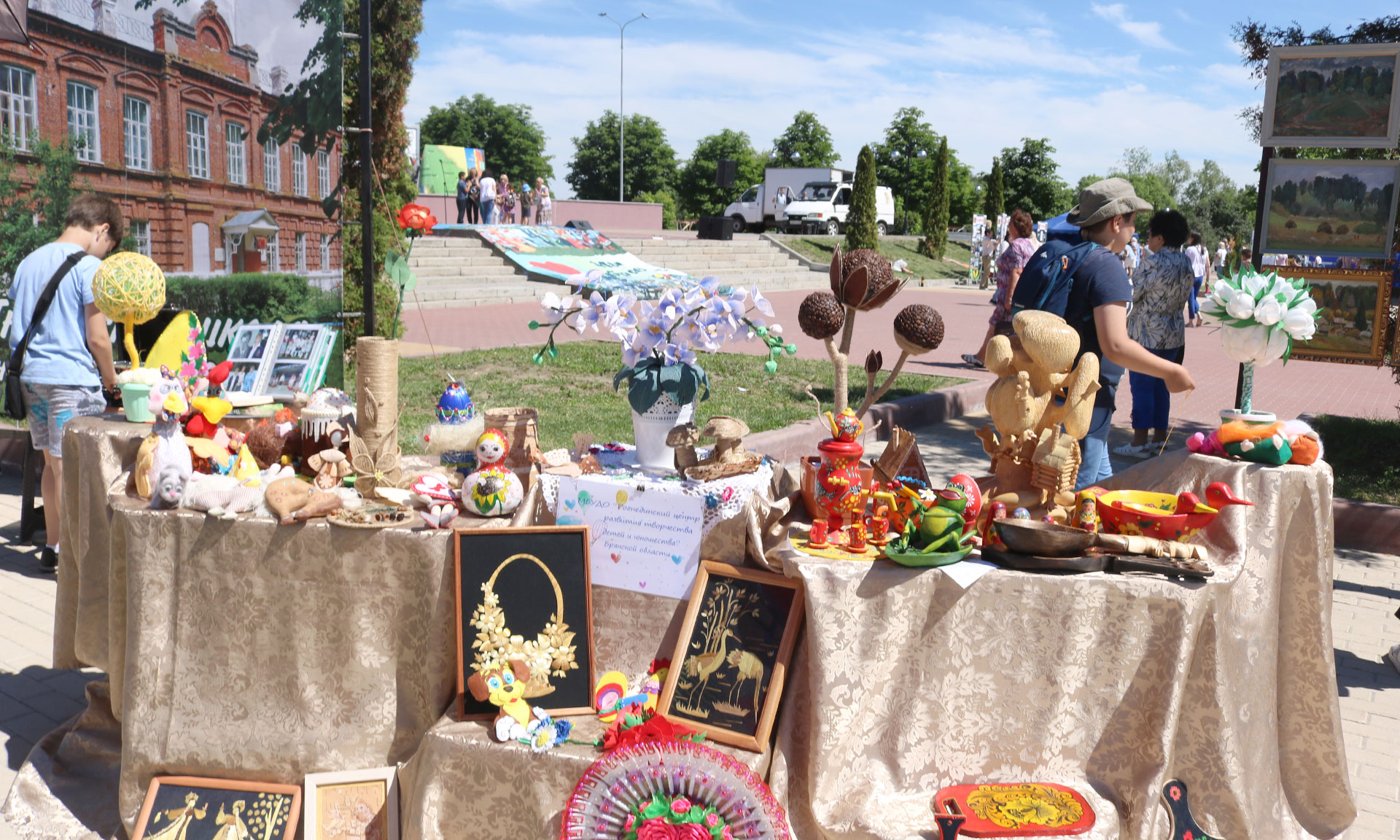 Многолюдно было и на площадке, где демонстрировались уникальные творческие работы, выполненные в разнообразных техниках народными умельцами. Разнообразные изделия из бисера, картины (вышитые и нарисованные), рушники, куклы-обереги и многое другое по достоинству оценили жители и гости Брянска.